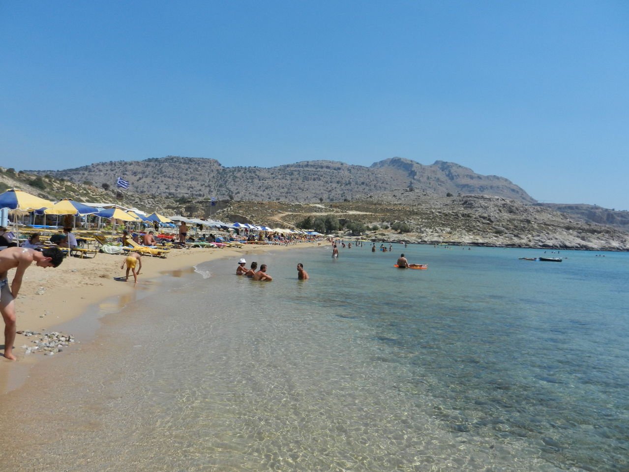 The main area of the beach is rocky, but there is a small sandy area a little to the side. Crystal clear water, easy access to the water, no waves or wind – in short, this is another best beach on the map of Rhodes, offering a relaxing holiday.