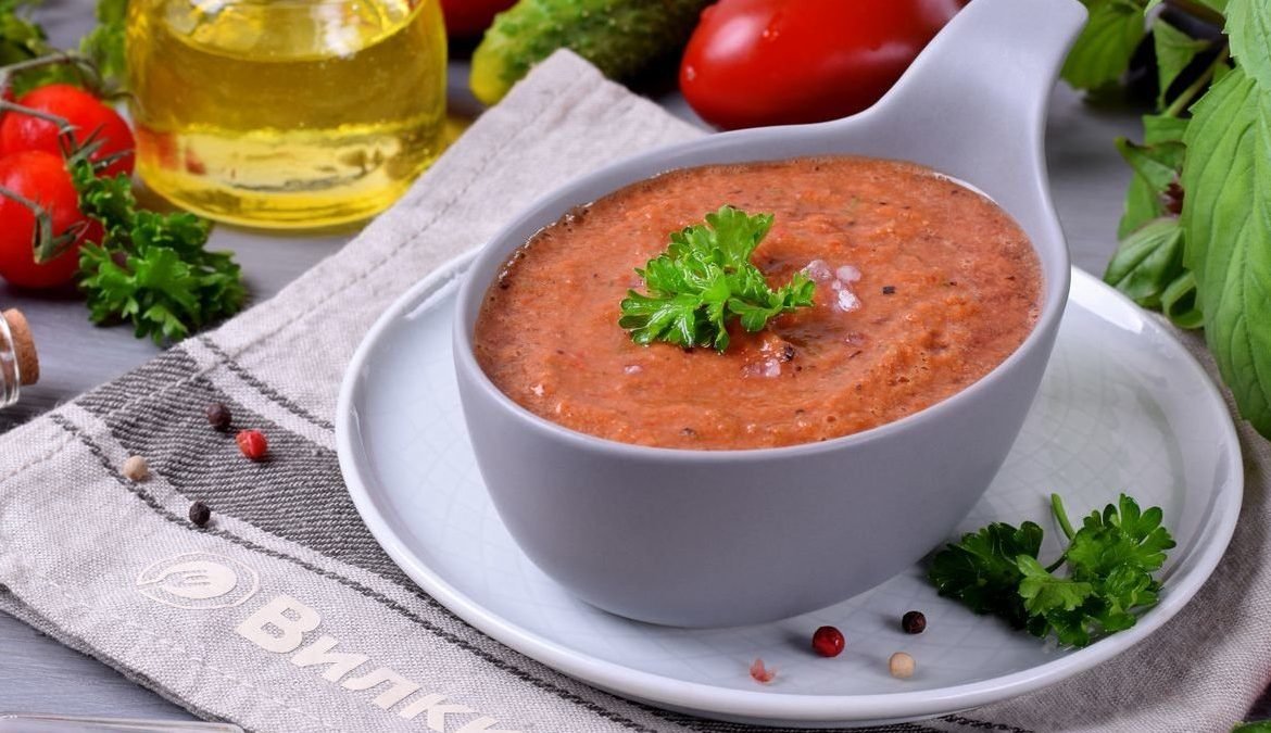 Gazpacho is a soup made from crushed tomatoes, cucumbers, sweet peppers, and pickled onions. Bread crumbs are used to add thickness. All this is blended into a homogeneous mass, refrigerated for a while, and before serving, diluted with tomato juice or dry white wine.