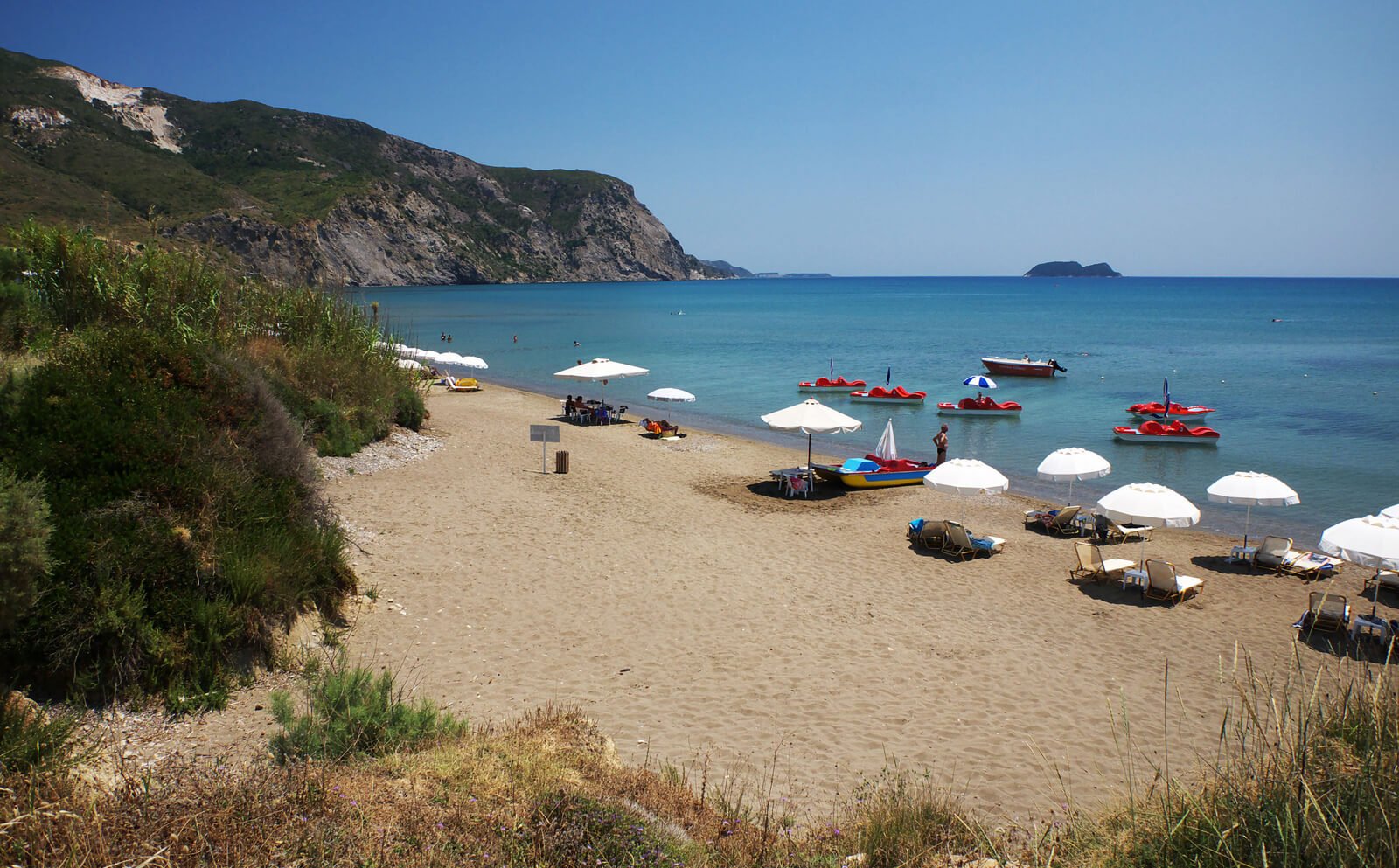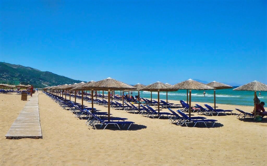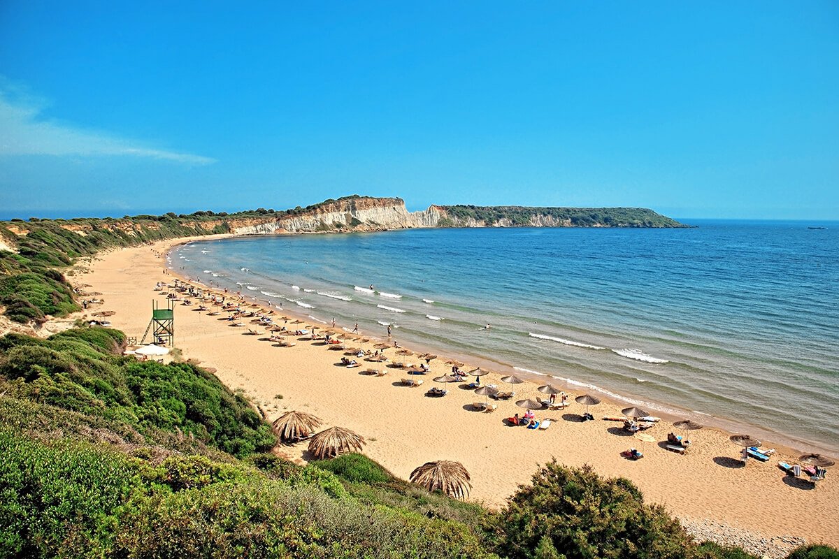 A picturesque place on the Vasilikos peninsula, just 18 km from the capital of Zakynthos. The beach here is soft, sandy, and the shore offers an incredible view of the bay. Since the depth is small, the water here warms up well, which makes the place a favorite for family holidays. Serious depth begins only 100-150 meters from the shore.