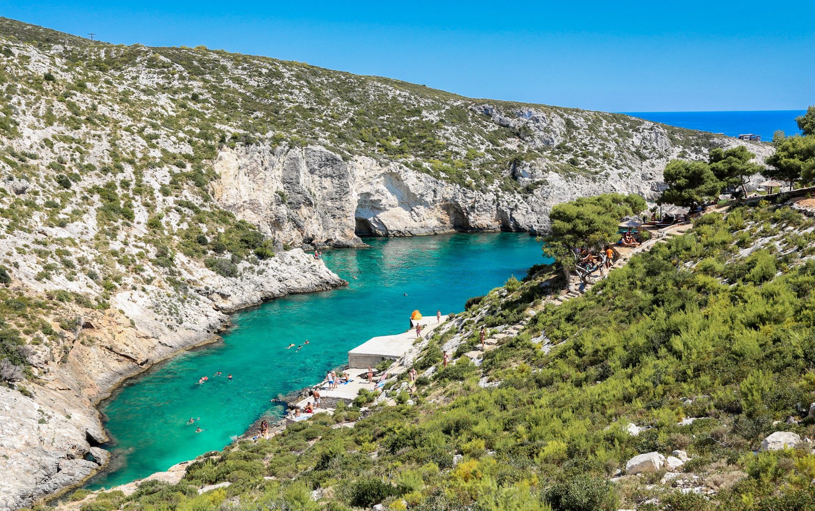 The beauty of pristine nature is fully revealed here. The place is hidden among the bays in the western part of Zakynthos. The coastline is jagged, the beach is protected by rocks, and the water has an incredible azure hue.