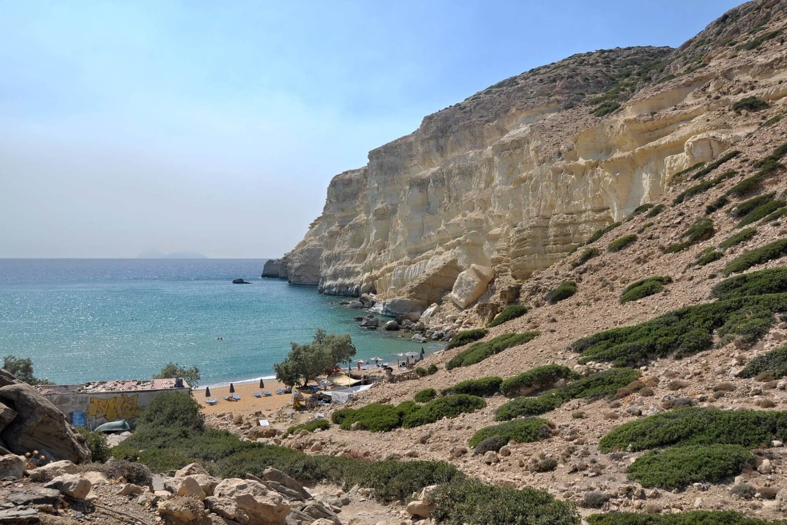 One of the most exotic and extraordinary beaches, Red Beach (Red beach), is half a kilometer from the village of Matala. This amazing corner of red sand among rocky shores was discovered by hippies in the 1960s, who promoted merging with wild nature. Despite the rather challenging trek along “goat paths,” Red Beach is very popular with tourists. The journey through the mountain pass adds adventure and physical exercise.