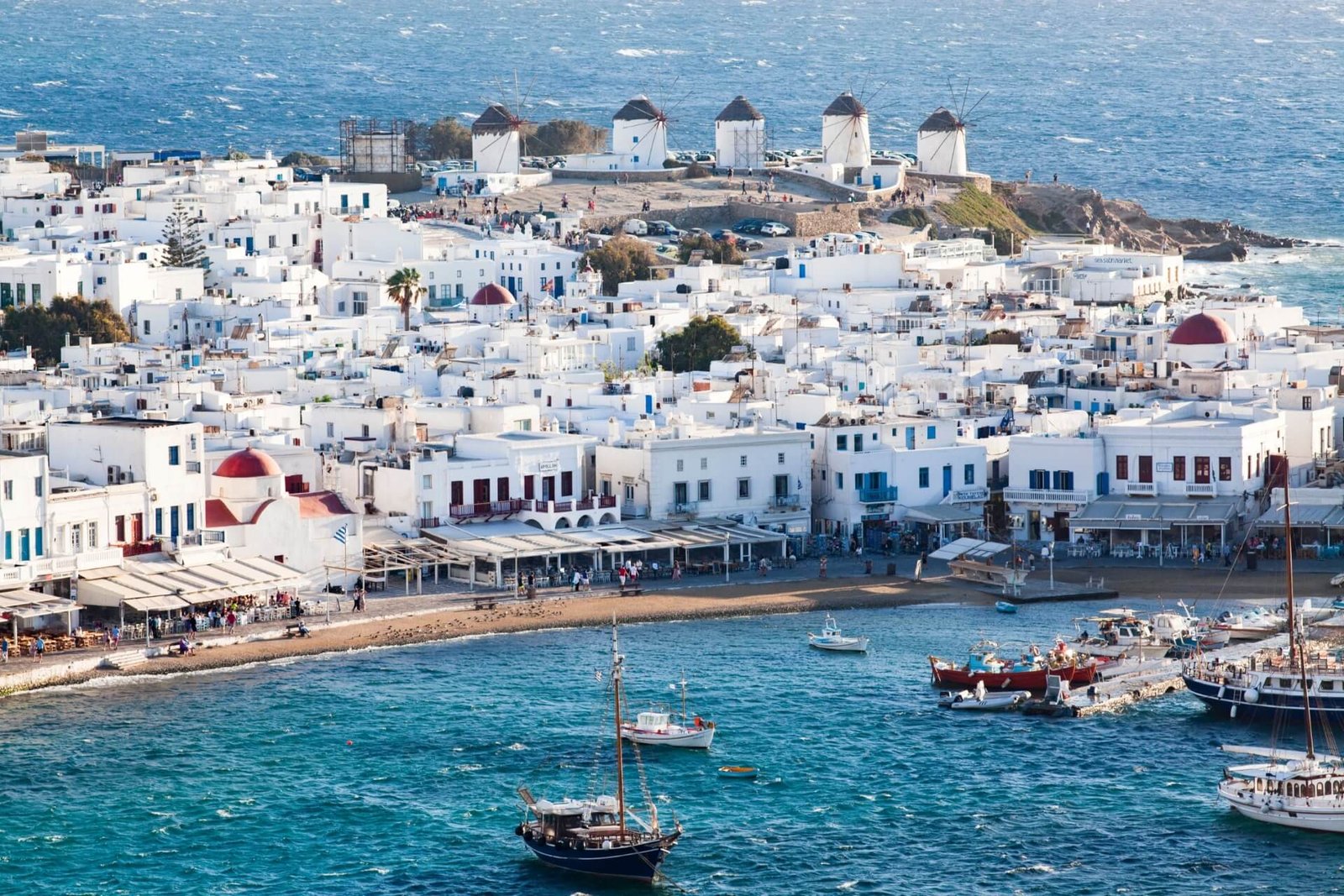 Main landmarks include windmills and white buildings. Super Paradise Beach is the most popular, bustling with activity day and night. Stay here all day and night without getting bored.