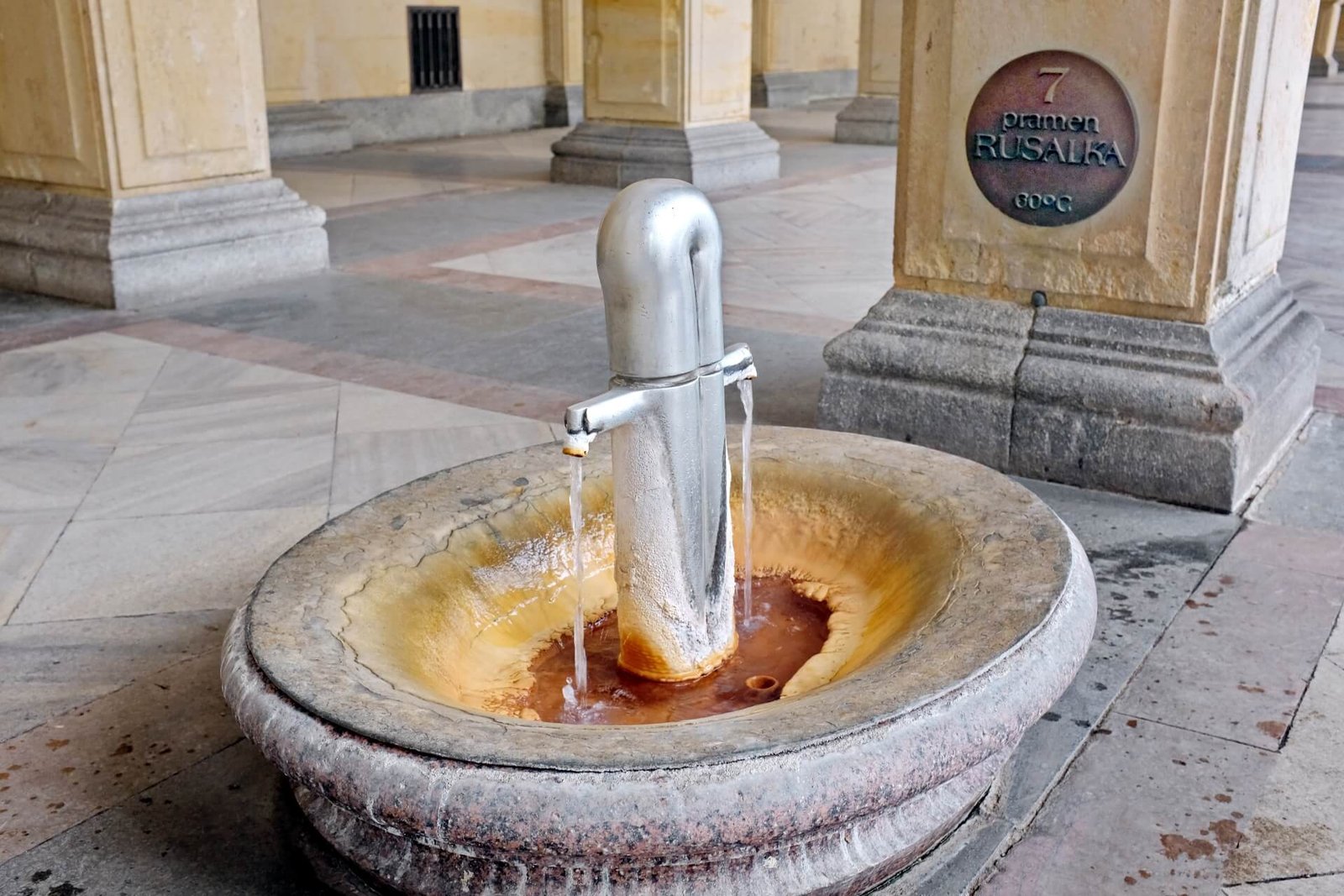 The water is quite hot — 64 degrees Celsius. It flows at a rate of 4.8 liters per minute and is rich in carbon dioxide — 250-450 mg/l. The spring is located in the historic city center, a five-minute walk from the Geyser.