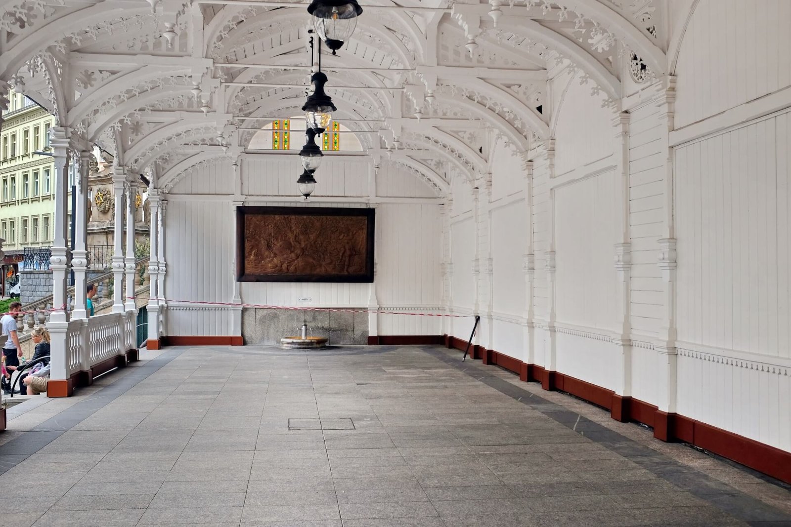 Here, in the heart of the city, there once stood an old bathhouse. After the healing waters helped Charles IV recover, the place gained popularity. A small gazebo and walking veranda were built over the springs. In 1883, an elegant carved promenade in the Swiss style was constructed on the site of the town hall. In the early 20th century, it was extended to the Market Spring. Today, visitors can use water from three springs — Market, Lower Castle, and Charles IV.