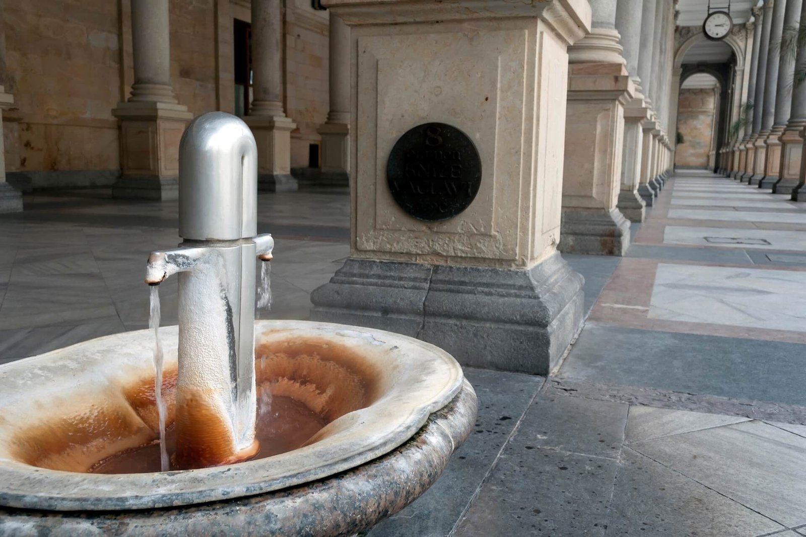 In 1852, the Military Sanatorium was established in Karlovy Vary. During the construction of its foundation, a water spring was discovered. Initially named the Imperial Spring, its water was used for sanatorium patients. The water flow is divided into two parts — one directed to the hall, the other to the basement. From 6:00 AM to 6:30 PM, visitors can taste this water with a subtle sour taste.