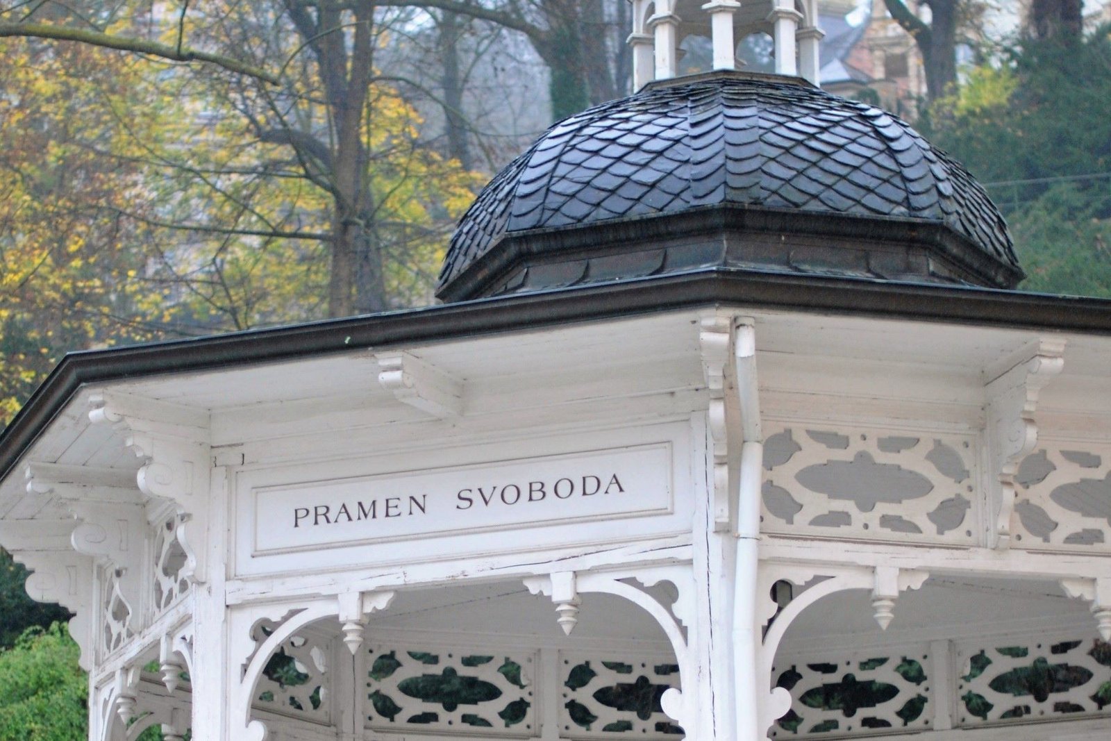 The octagonal wooden structure blends harmoniously with the landscape. The name changed several times — initially called the Spa Spring, it was later named after Emperor Franz Joseph I, and in 1946, it was renamed “Freedom.” It is located 600 meters from the Geyser, near Lázně III. The spring provides 5 liters of hot water (temperature 62.4 degrees Celsius) per minute, with a carbon dioxide content of 0.55 g/l.