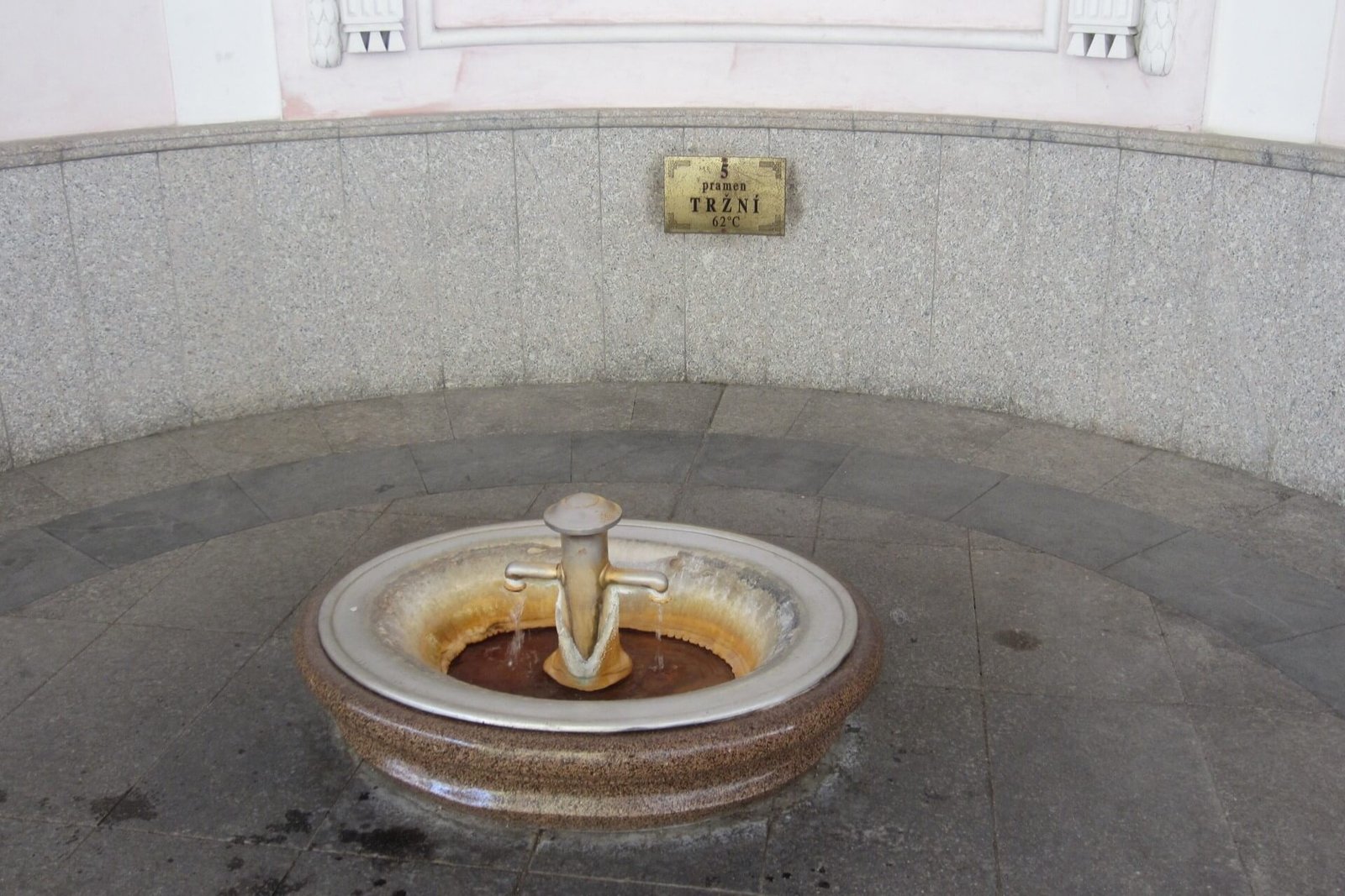 The building was demolished in 1904, and a wooden Market Colonnade in the Swiss style was built, like many structures in Karlovy Vary. The place where the water flows is particularly interesting. It is a semicircular apse with stunning acoustics, often used for concerts. The spring is located just 200 meters from the Geyser. The water temperature is 62 degrees Celsius, with a flow rate of nearly 5 liters per minute. Each liter contains 0.5 grams of carbon dioxide.