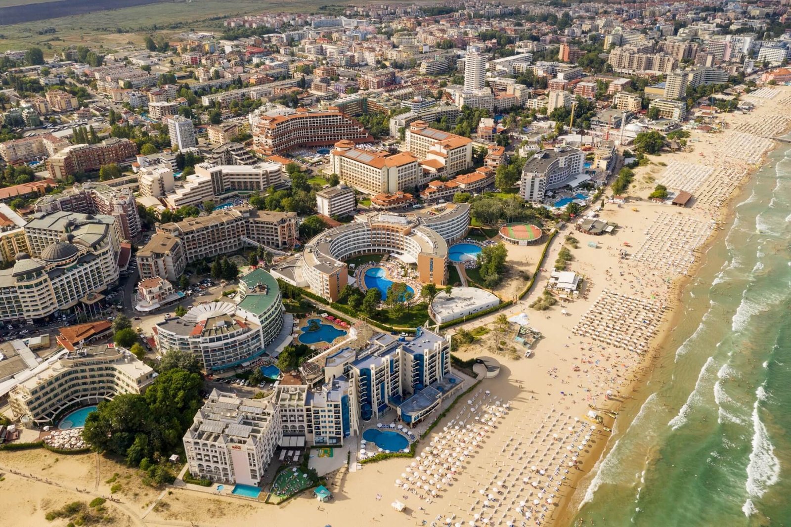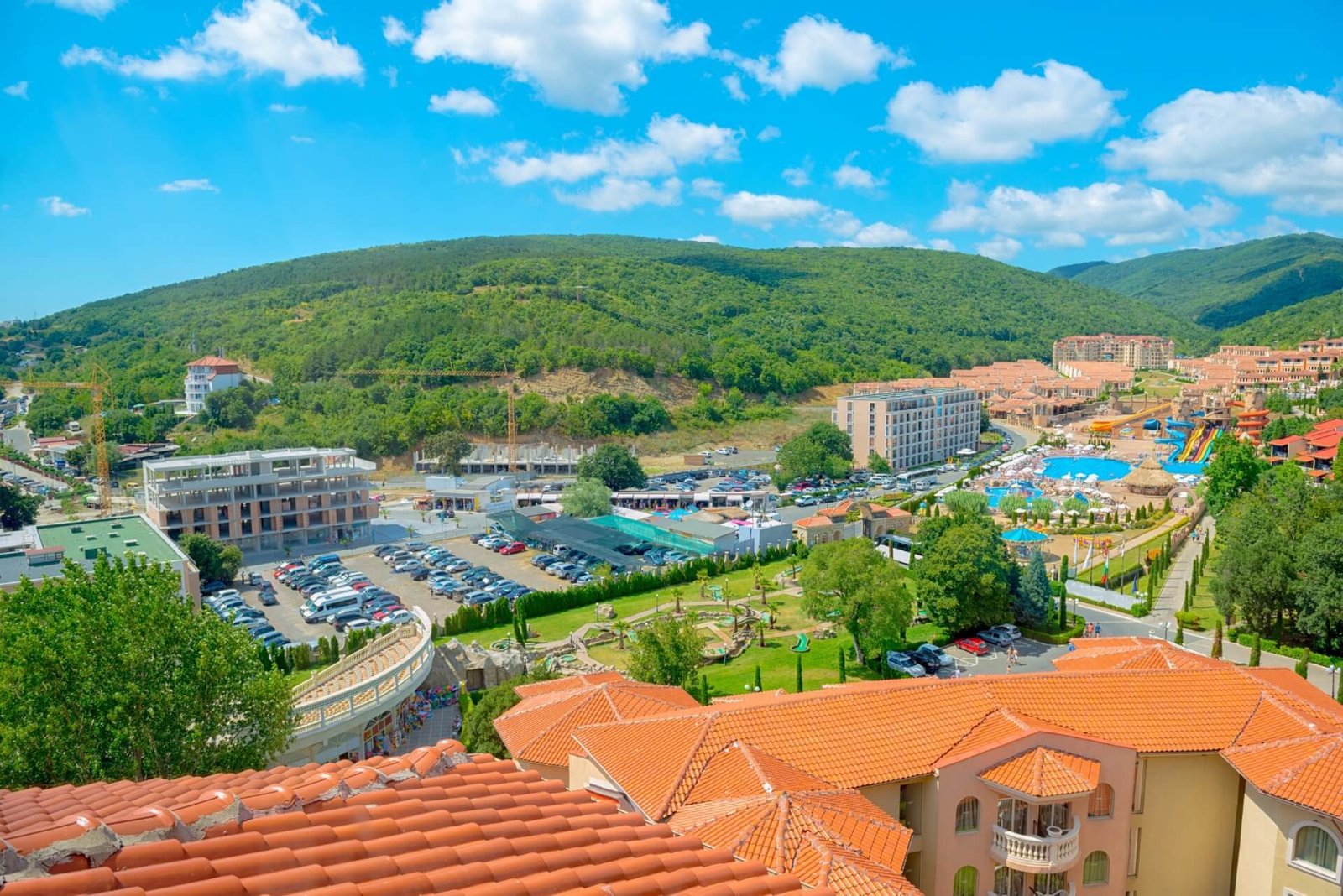 Walking around the city, immersed in greenery, is pleasant. There are many playgrounds, the “Paradise” water park, and no obstructive high-rises. You can also visit the water park in neighboring Sunny Beach.