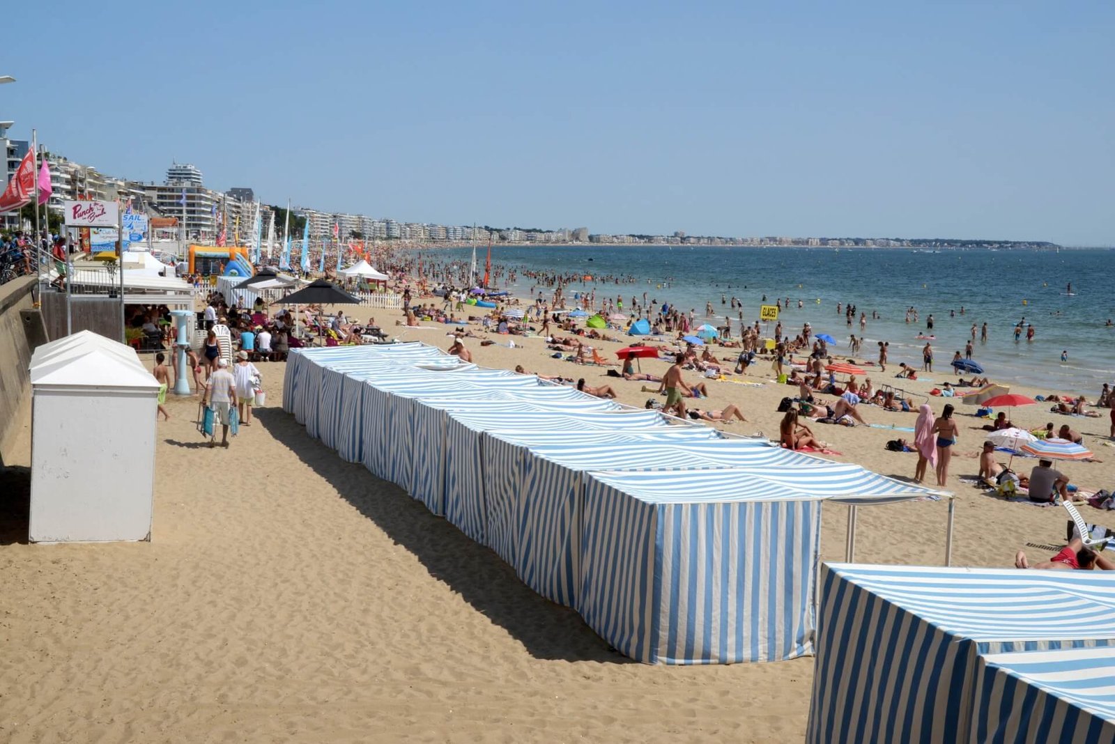 A wooden walkway runs parallel to the beach for comfortable strolling. Changing rooms are historic beach cabins with carved partitions decorated with the names of American movie stars.