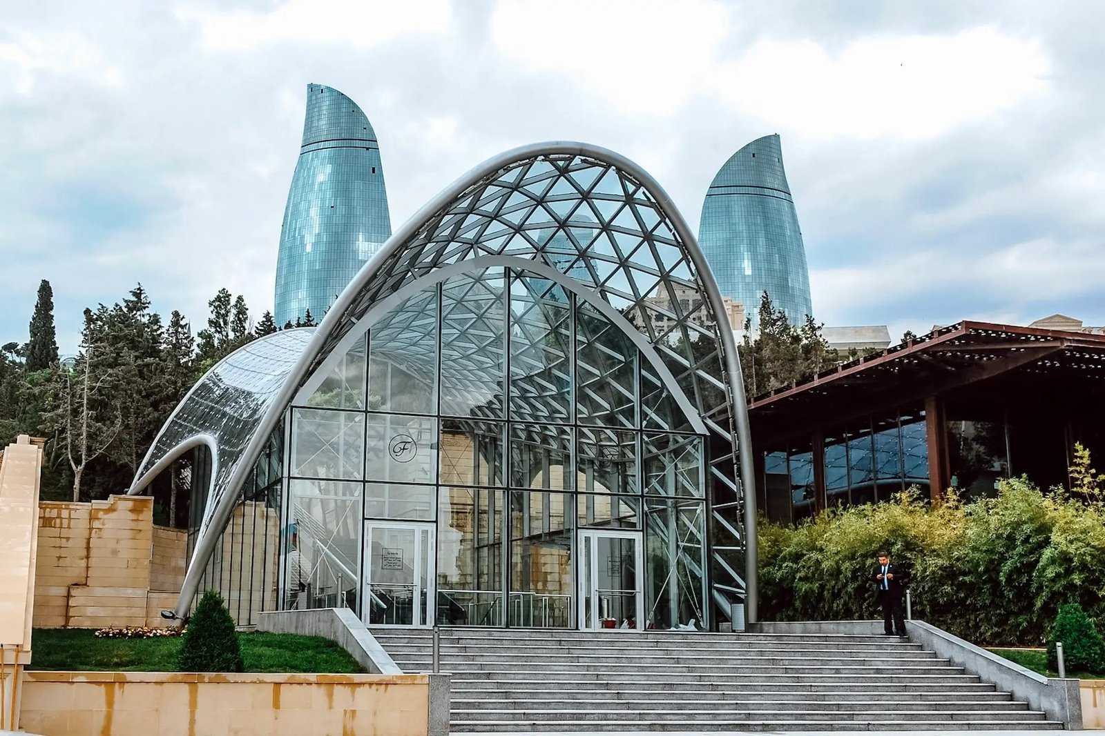 At the end of the 455-meter route, the carriage enters the upper station with a glass facade directly to the famous Flame Towers with a small mosque. From the station, you can move to the observation deck of the Highland Park, offering a beautiful city panorama.