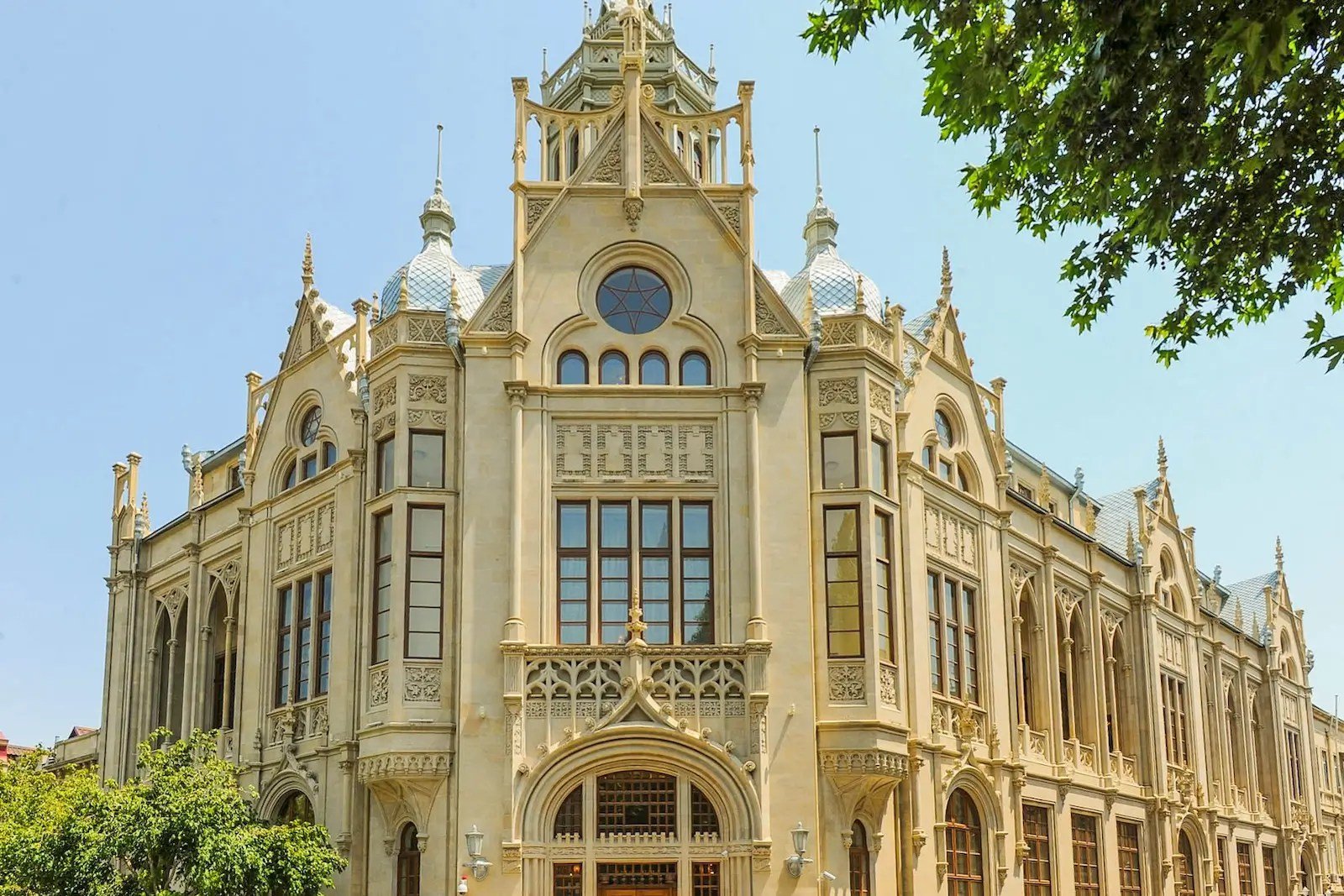 This is a building where, besides the government apparatus, the ministries of the republic and several municipal organizations of Baku are located. The architecture of the monumental building combines baroque elements and eastern motifs. Rows of lacy arched galleries, decorating the facades of the corner towers of the majestic structure, stand out particularly.