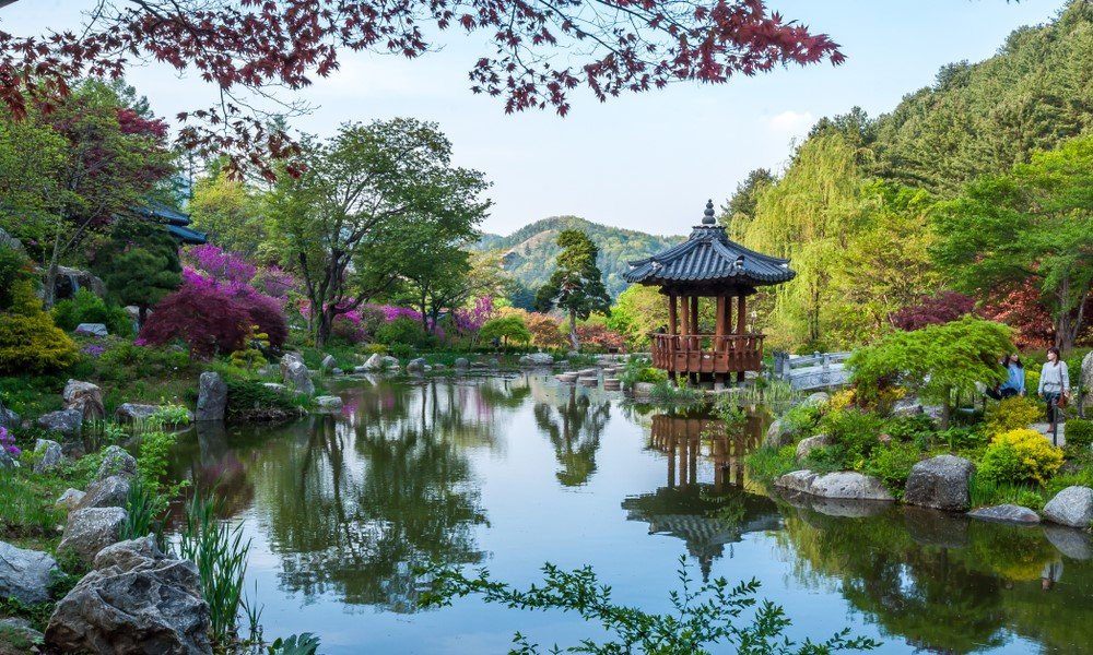 The Garden of Morning Calm is located on Yeongju Mountain in the city of the same name in Gyeongsangbuk-do Province. The mountain’s height reaches 879 meters. The city is 50 kilometers from Seoul. This place is a paradise for photographers and a must-visit for those who want to admire vibrant flowers and get acquainted with Korean nature. The arboretum is divided into 10 gardens with poetic names like “Road to Heaven,” “Garden of Promise,” and “Moonlight Garden.” The thematic zones are on different levels and connected by paths and walkways. There is a small church, a beautiful English house with a wild garden, a Korean hanok, a suspension bridge, a tea house, and a café. There is also a traditional pavilion with stone bridges in the middle of a pond, a waterfall, and a small mountain river. The observation deck runs along the top of the mountain, and early in the morning, it offers a view of the surrounding mountains covered in thick fog.
