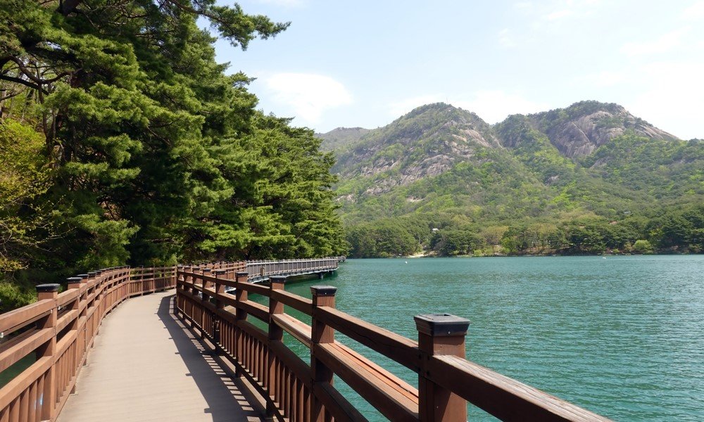 Captivating shots from the drama “Legend of the Blue Sea” show only a small part of one of the most popular tourist spots in Pocheon, an hour’s drive from Seoul. This is Sanjeong Lake, located in a picturesque area between Mount Manbongsan and Mount Manmubong. The emerald-colored water and oddly shaped rocks add grandeur to the landscape. Granite rocks were once quarried here, and the lake formed naturally from a pit later filled with spring and rainwater.