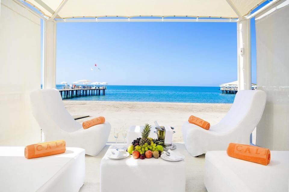 Located on the Mediterranean coast. It has its own spacious beach. In addition, the hotel owns 5 pools. In one of them, water flows down “stone terraces.” Several pools have slides. There are 4 tennis courts here, allowing everyone who wants to play without waiting even in the high season.