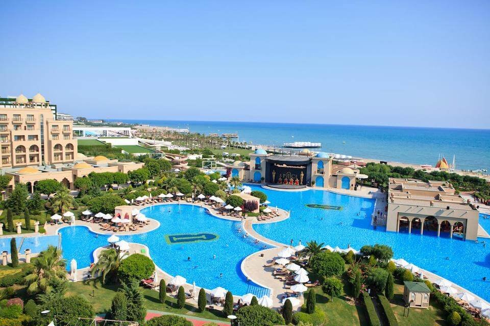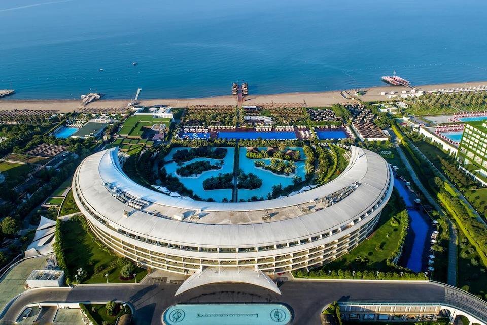 Guests are awaited by 600 rooms in the six-story main building, 7 three-story family buildings, and 17 villas. You can eat in the main restaurant, divided into thematic zones by world cuisines, and 3 others operating according to the menu — Turkish Hasir, Italian La Paglia, and fish Oceanos. There is also a pastry shop, a tea and coffee house, an Irish pub, bars, and a hookah lounge.
