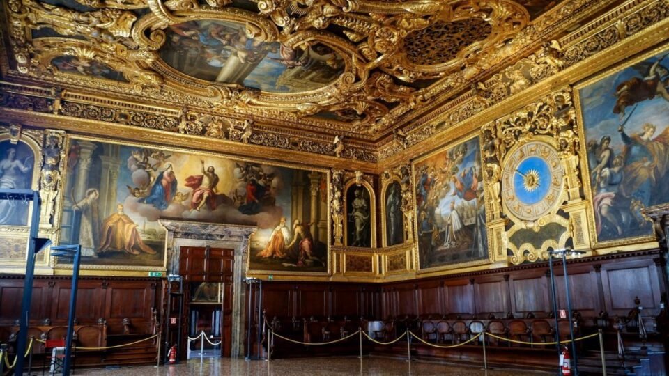 - Great Council Hall: Considered the largest hall in the country. After reconstruction, it features the Doge’s throne, huge chairs for the six members of the Small Council, and portraits of all the Doges. The entire wall is occupied by the famous painting “Paradise,” considered the largest painting in the world. The hall’s windows offer a beautiful view of the lagoon.