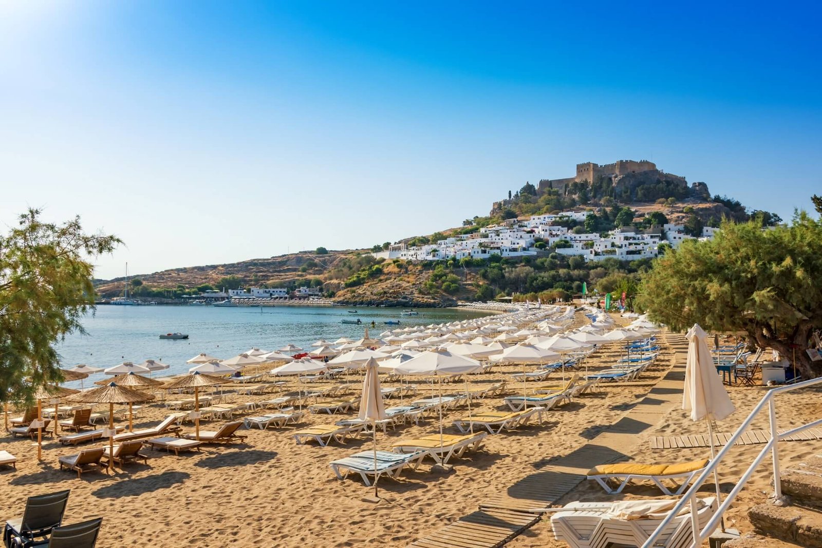 One of the most popular vacation spots on the island is the resort town of Lindos. It is 56 km from Rhodes City. The ideally clean beach (awarded the “Blue Flag” for several consecutive years) on the Mediterranean coast is covered with silky sand, has a gentle entrance to the sea, and safe conditions for family vacations. Many colorful fish swim in the sea, approaching people and feeding on bread crumbs.
