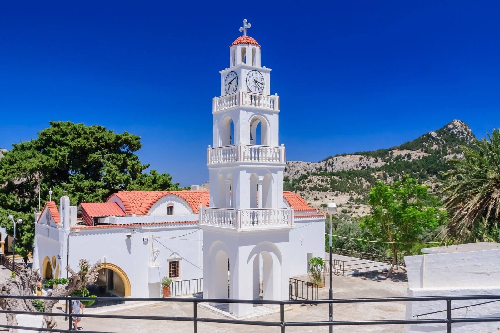 An oak tree with a huge hollow grows next to the monastery. It is several centuries old. It is considered the island’s oldest tree. Every traveler strives to enter the hollow. To reach the monastery, follow the island’s east coast to Kolymbia, then turn towards Archipoli. There is parking and a tavern near the monastery building. You can buy mountain honey there. The beautiful area is often used for weddings, baptisms, and picnics.