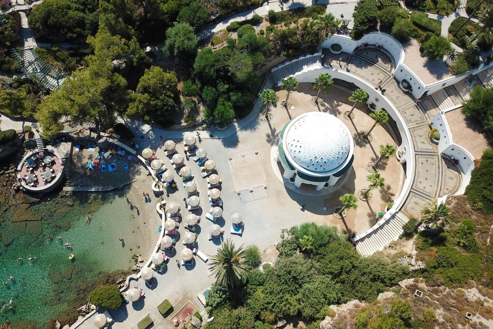 For deep-water lovers, a pontoon is equipped over the stones. The shore of the bay is covered with small pebbles and large stone boulders. The bay’s name is associated with the famous actor Anthony Quinn. According to local legend, the actor’s activities are linked to the birth of the “Sirtaki” dance, which became a symbol of Greece.