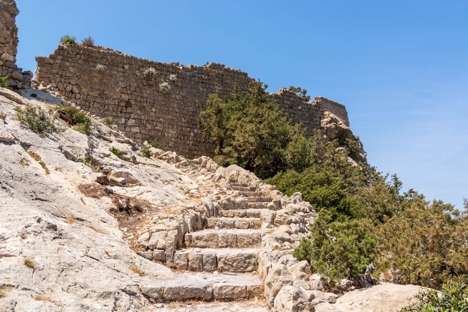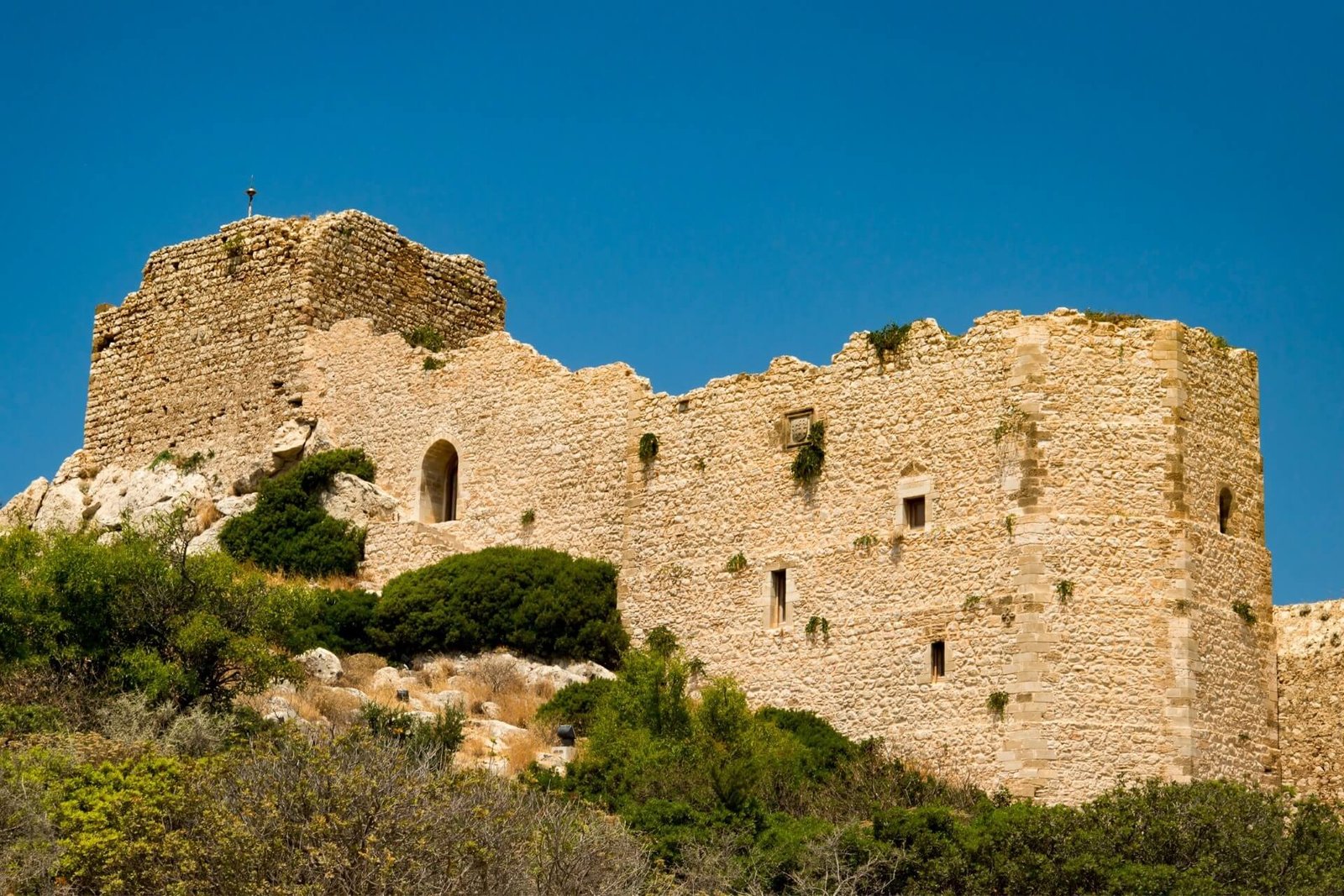 The small town of Kritinia was founded by settlers from the island of Crete. There are many such settlements along the Aegean Sea coast. Knights built fortresses in them to protect against Turkish warriors and constructed castles. The castle is on top of a cliff and rises above the sea at an altitude of 131 m. It is surrounded by beautiful green pine plantations.
