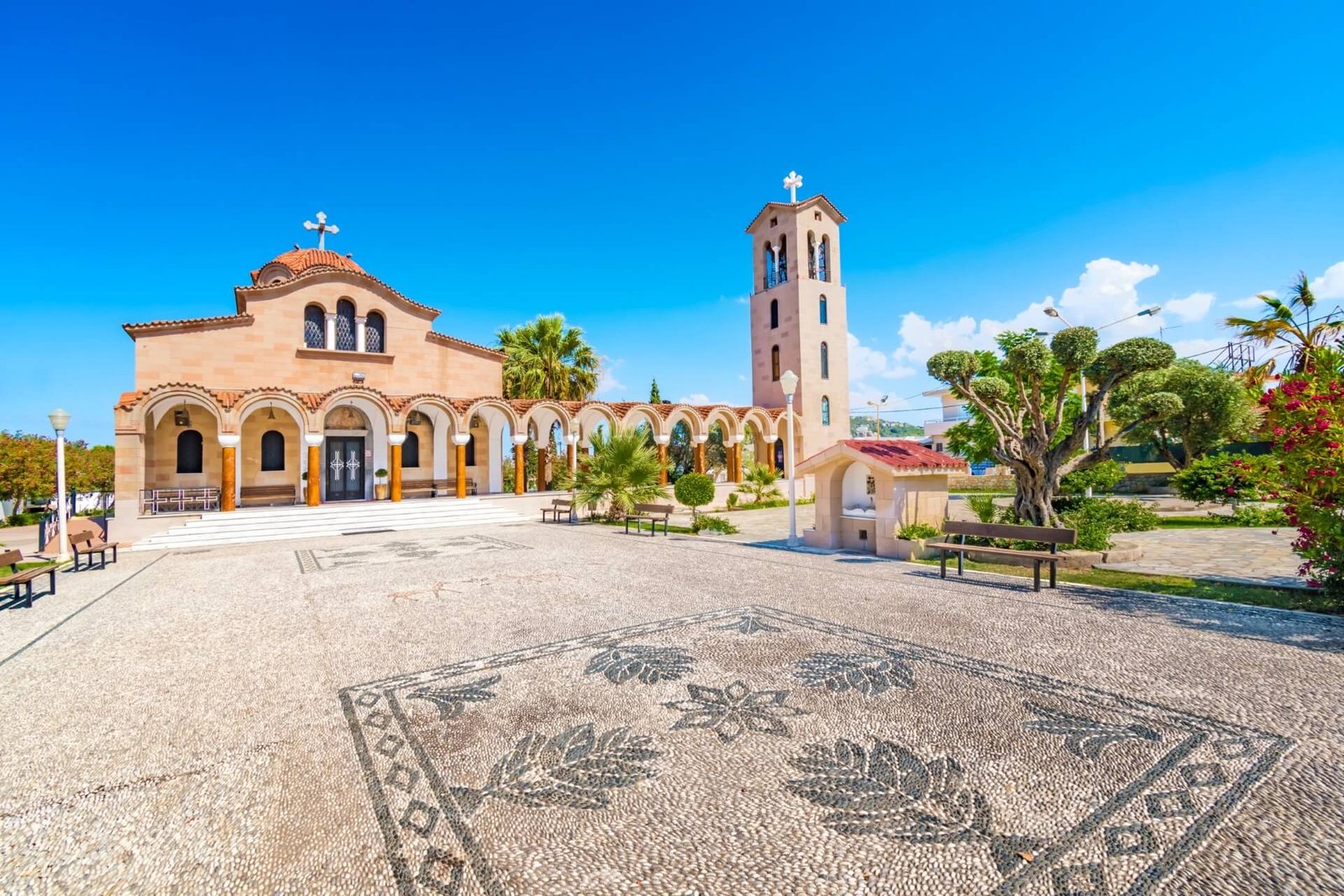It is 8 km from the island’s capital and near Faliraki, filled with fun in nightclubs, restaurants, and discos. In a rented car, it is easy to visit the church with ancient wall paintings, the Traganou waterfront with famous caves, Ladiko Bay, and the Erimokastro fortress.