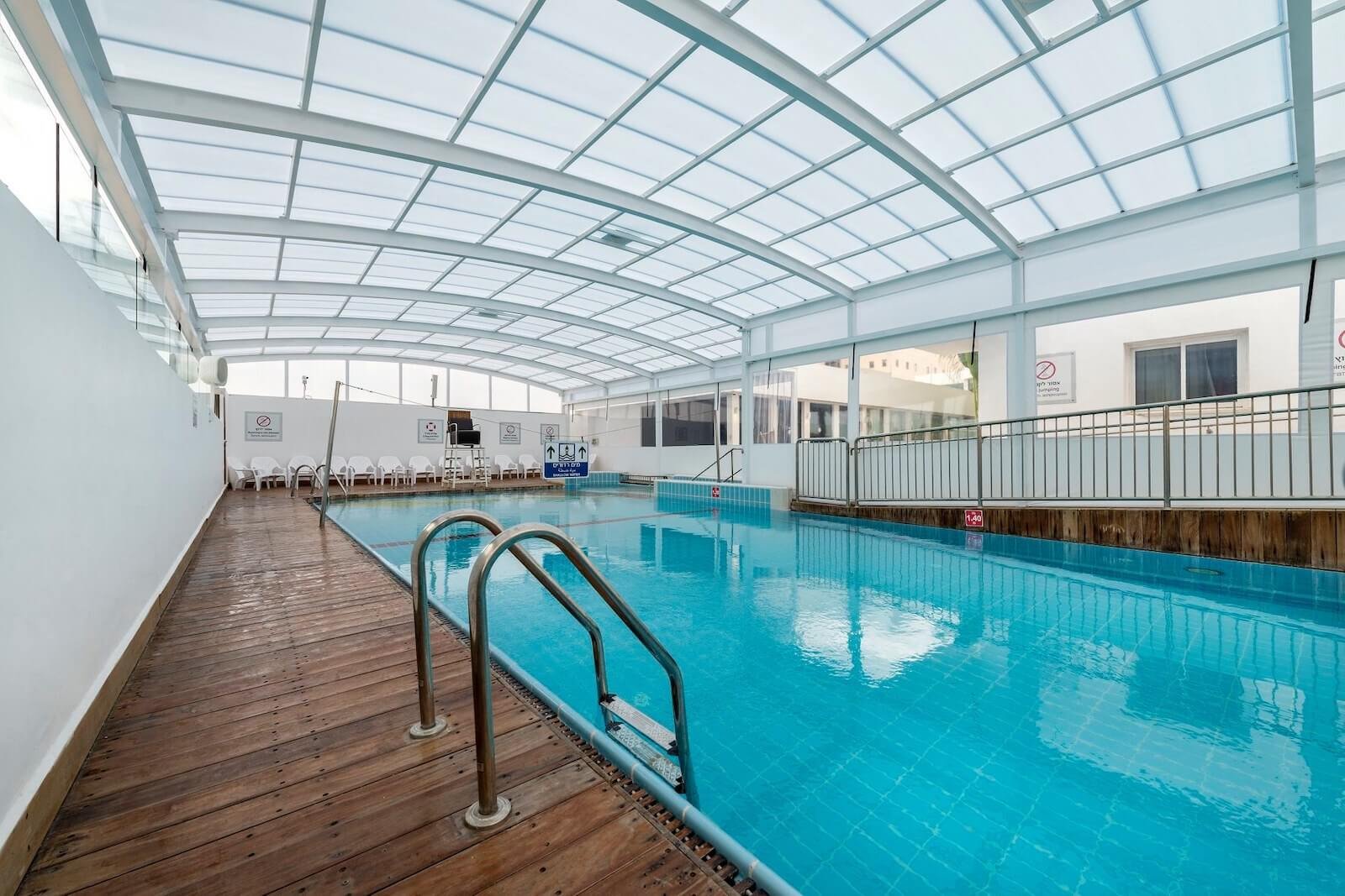 In the warm season, you can swim in the open semi-Olympic pool. Inside the building, there is a smaller heated pool, open year-round.