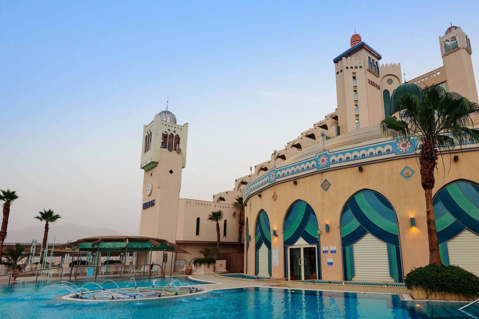 Five hundred employees ensure a comfortable stay for guests in one of the 297 rooms at “Herods Palace” in Eilat. The room designs match the style of an oriental palace. Mosaics, sculptures, and balconies offer views of the sea, pool, and Jordan, which is just a stone’s throw away.