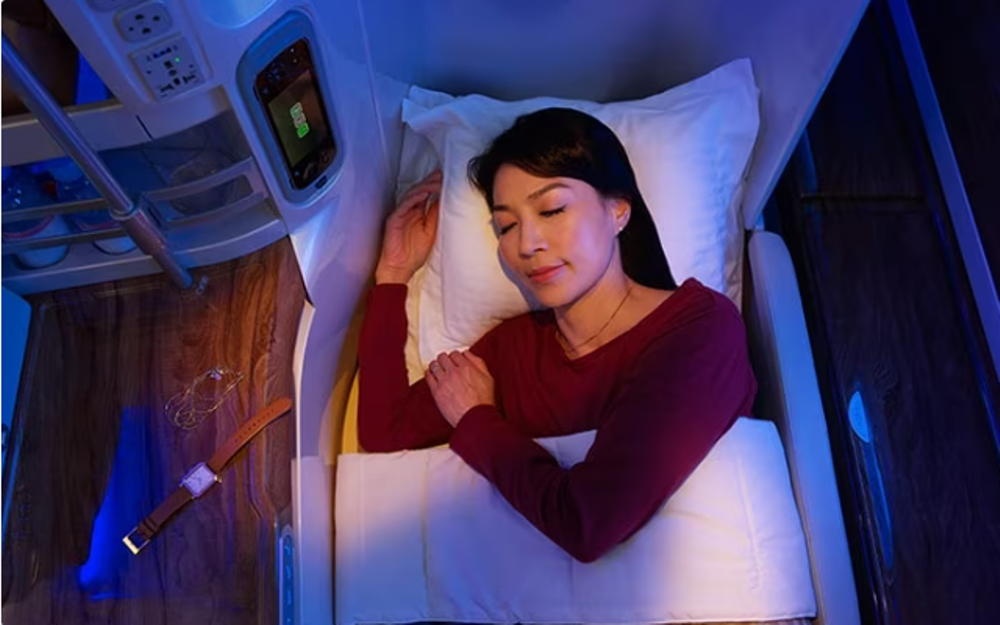 What does Singapore Airlines offer passengers who have purchased business class tickets? It depends on the type of aircraft. The A380 has several advantages. The main feature of the natural leather seats from Poltrona Frau is the ability to unfold them into a comfortable bed with the push of a button. Seats in the central row are suitable for couples. They are equipped with a full-length divider, but it can be lowered if you do not want to part from your neighbor. Each passenger receives personal slippers and a sleep mask, and there is a set of Penhaligon’s toiletries in the restroom.