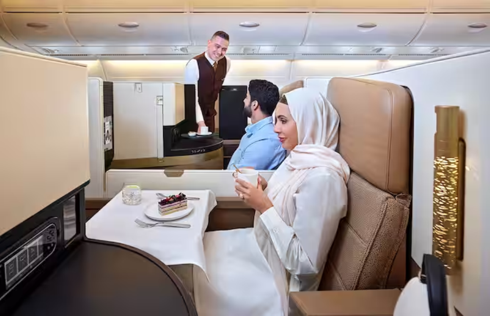 Business class on Etihad Airways aircraft differs even in design. The famous designer Giorgio Armani contributed to the design of the cabins. The inspiration came from the traditions of the Emirates. Flight attendants greet passengers with a drink of their choice – from juice to champagne. Comfortable flight is ensured by adjustable seats with headrests, back support, and seat firmness regulation. Additionally, they have a large recline angle and plenty of free leg space.