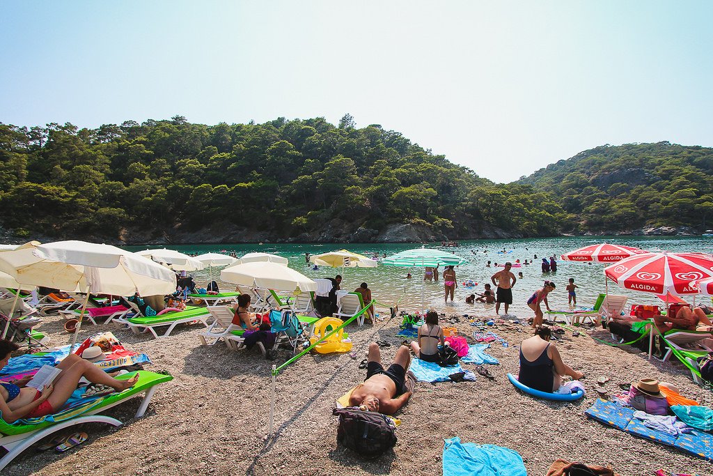 Photos of the Blue Lagoon in Oludeniz are certainly beautiful and make you want to visit this place, but, unfortunately, the beach is not as perfect as it might seem at first glance. During the high season, during the daytime hours, its territory is so overloaded with tourists that sometimes it is not possible to find a free place to relax. Sun beds and umbrellas are crowded, tightly fitting to each other, which creates discomfort. In addition, with large crowds, the promised clear turquoise water, which can be observed in the early morning hours, turns into a muddy green mixture. Therefore, we recommend visiting this beach in low season or early in the morning.