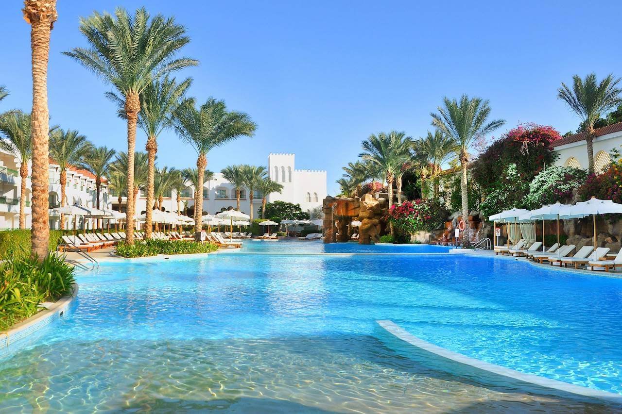 One of the best accommodations in Sharm El Sheikh. It consists of several parts, and the territory is decorated with a large garden. There are elegant two-story buildings with rooms overlooking the garden and a pool for adults and children, a kids’ club, and a river surrounding the territory.