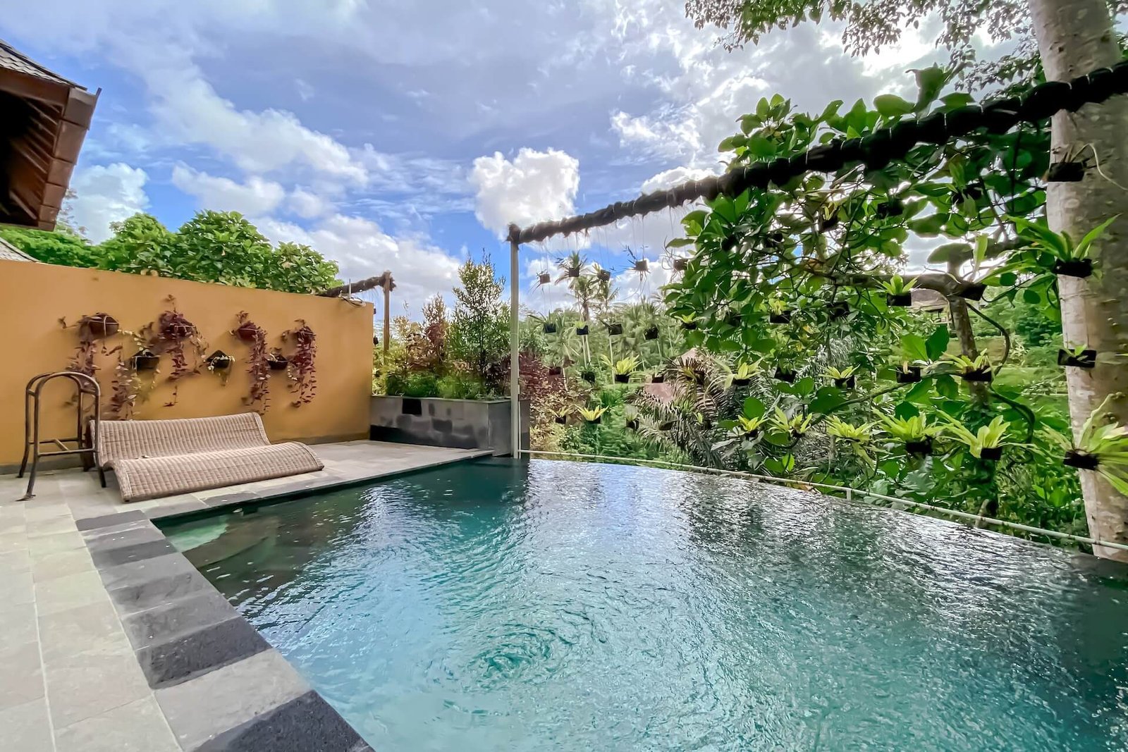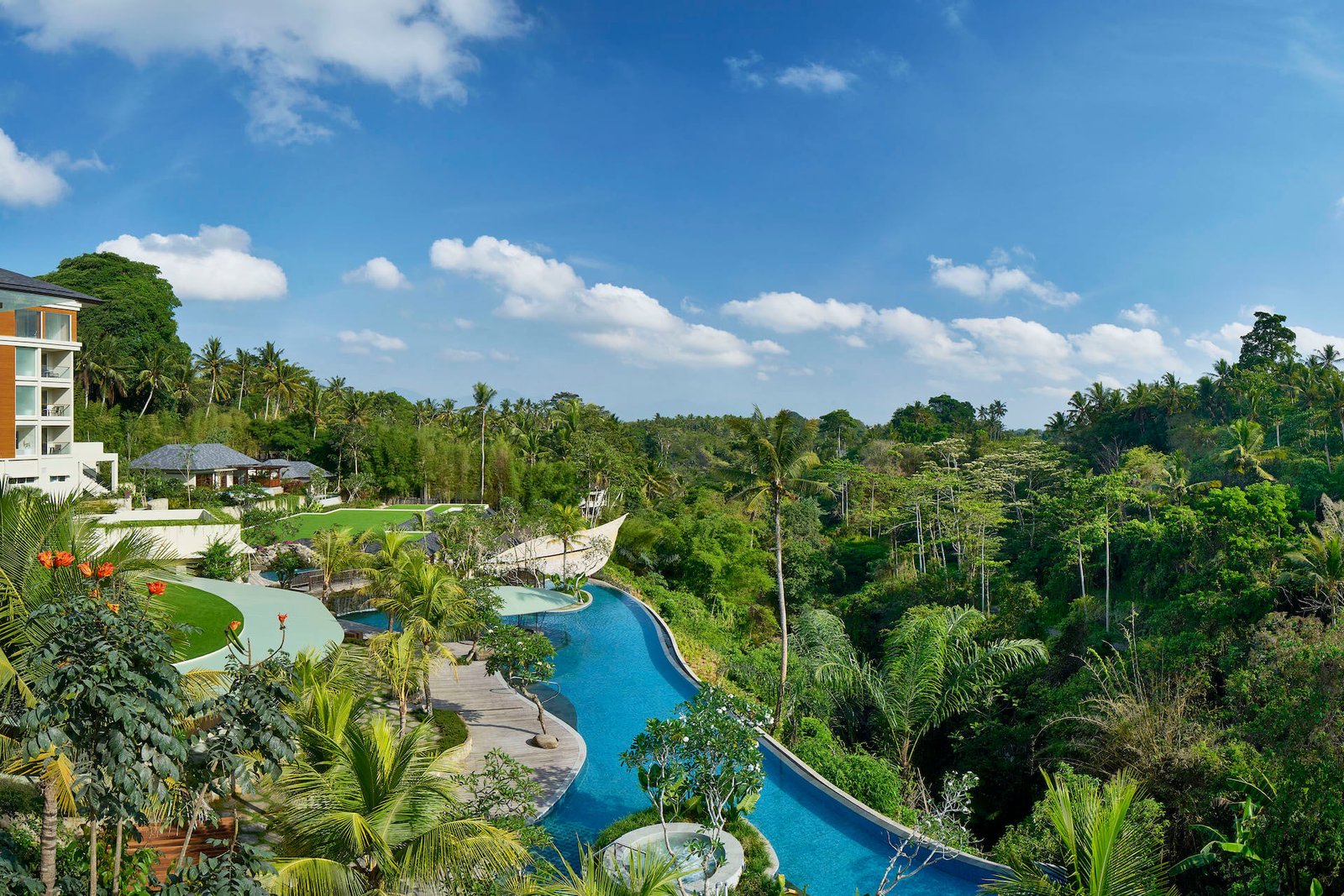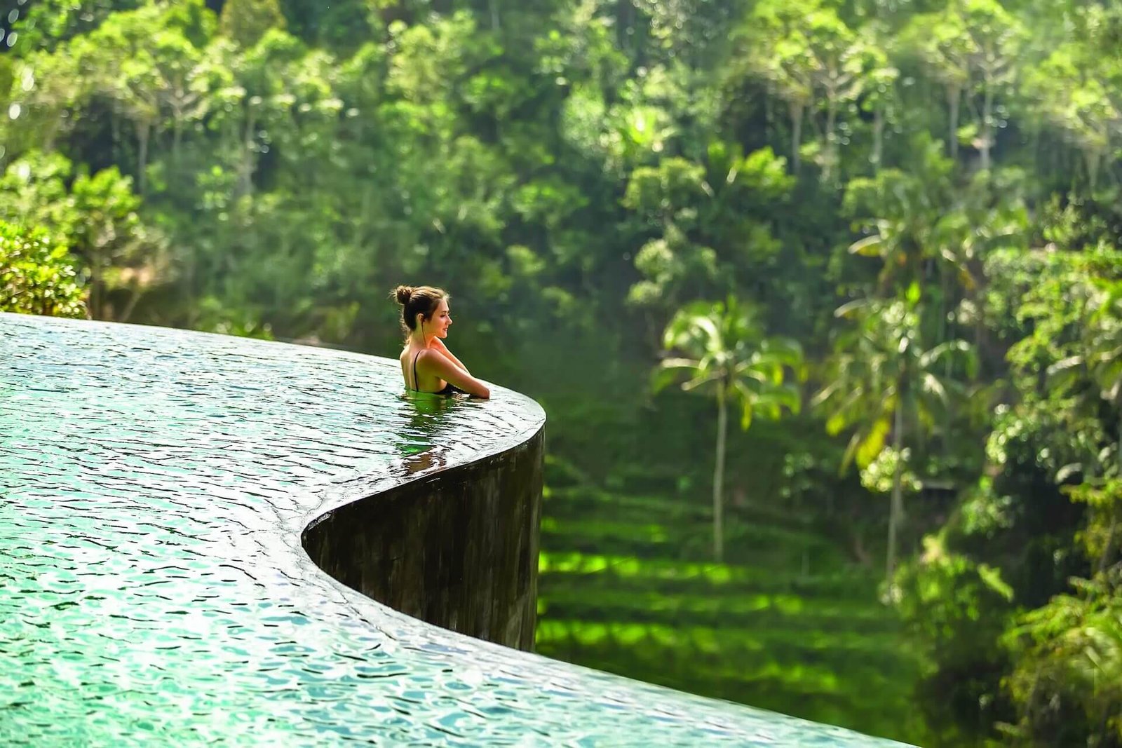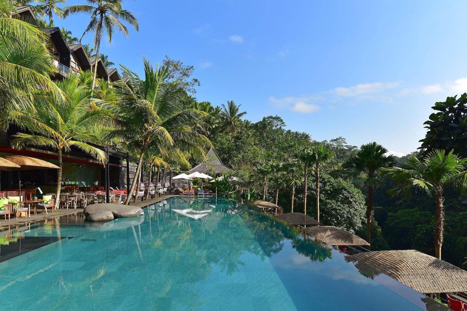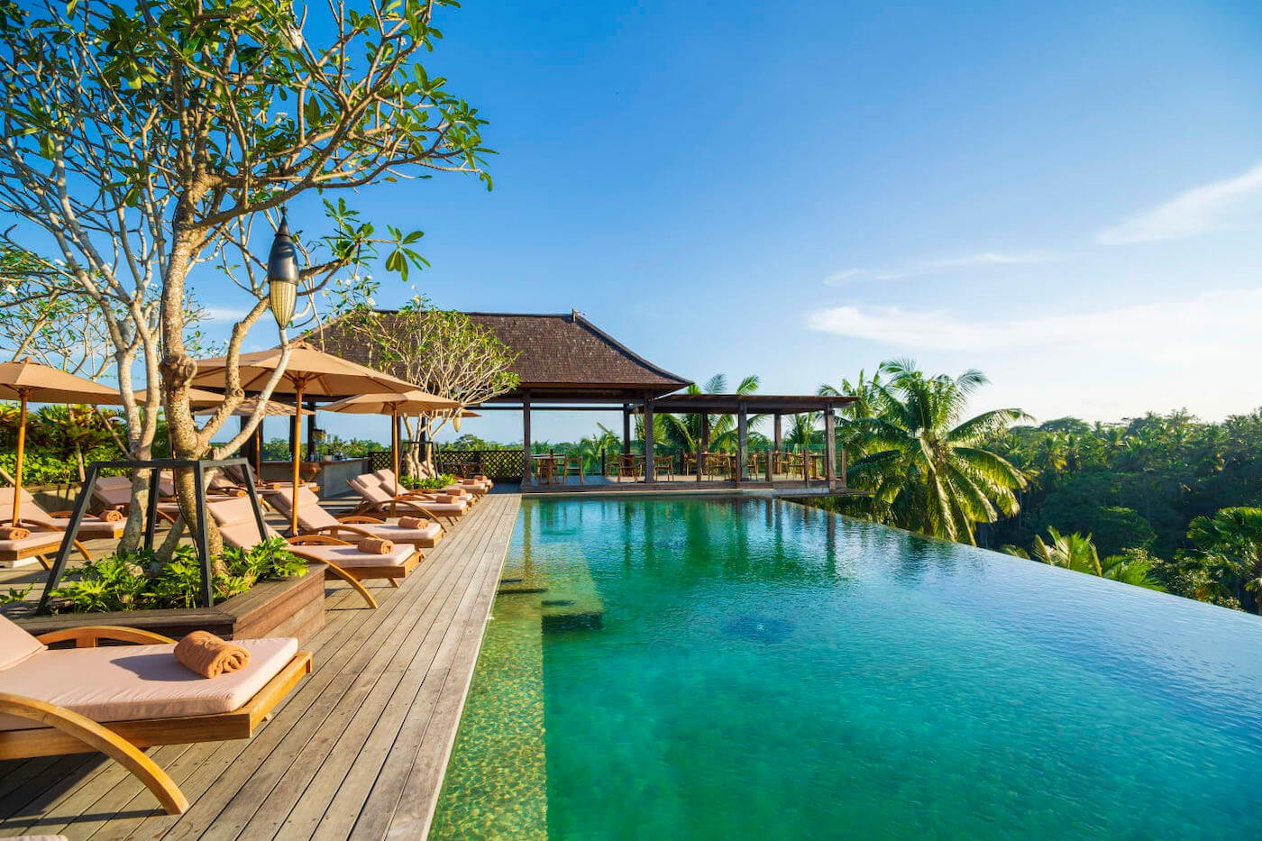 The Wanna Jungle pool and bar, inspired by the curves of the famous Tegallalang rice terrace, is spread across three levels. Each infinity pool provides a refreshing tropical retreat, with ample space on the terraces for sunbathing.