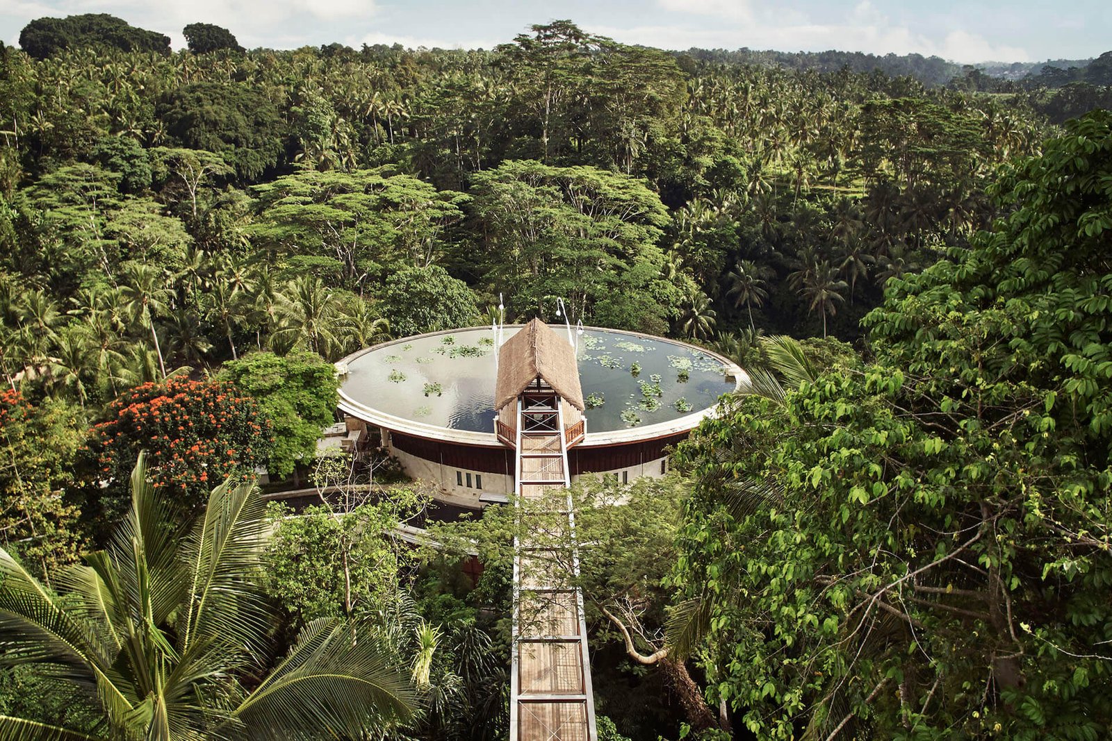 Surrounded by the tropical greenery of the Ayung River valley, this complex resembles a landed UFO when viewed from above. It blends seamlessly with the environment thanks to its unique architectural design.