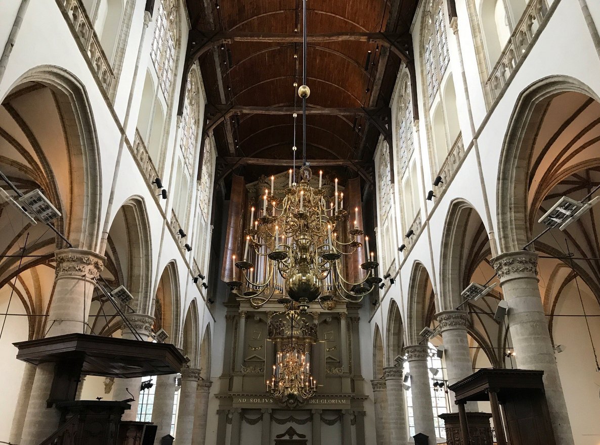Huge columns-arches let in a lot of daylight to the interior of the church. This gives visitors the opportunity to see in detail the unique carved ceiling and wall decoration. Inside the church there are organ installations: a small organ, authored by master Jan van Covelens, and a large one, built in the middle of the XVII century. By Jacob van Hagerber. The small one is one of the oldest working instruments in the country, and the big one claims to be the most beautiful instrument in the world.