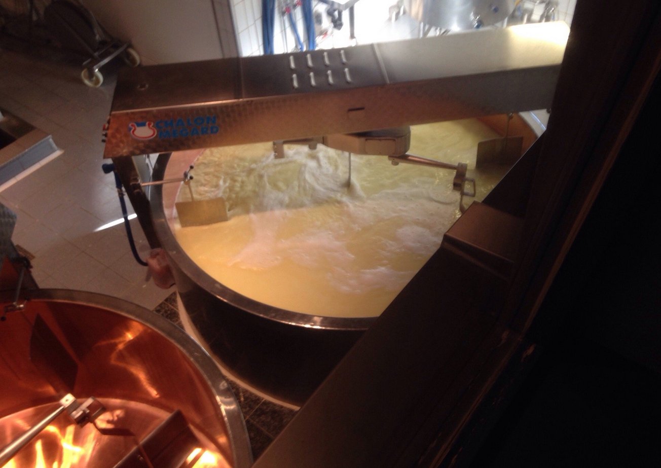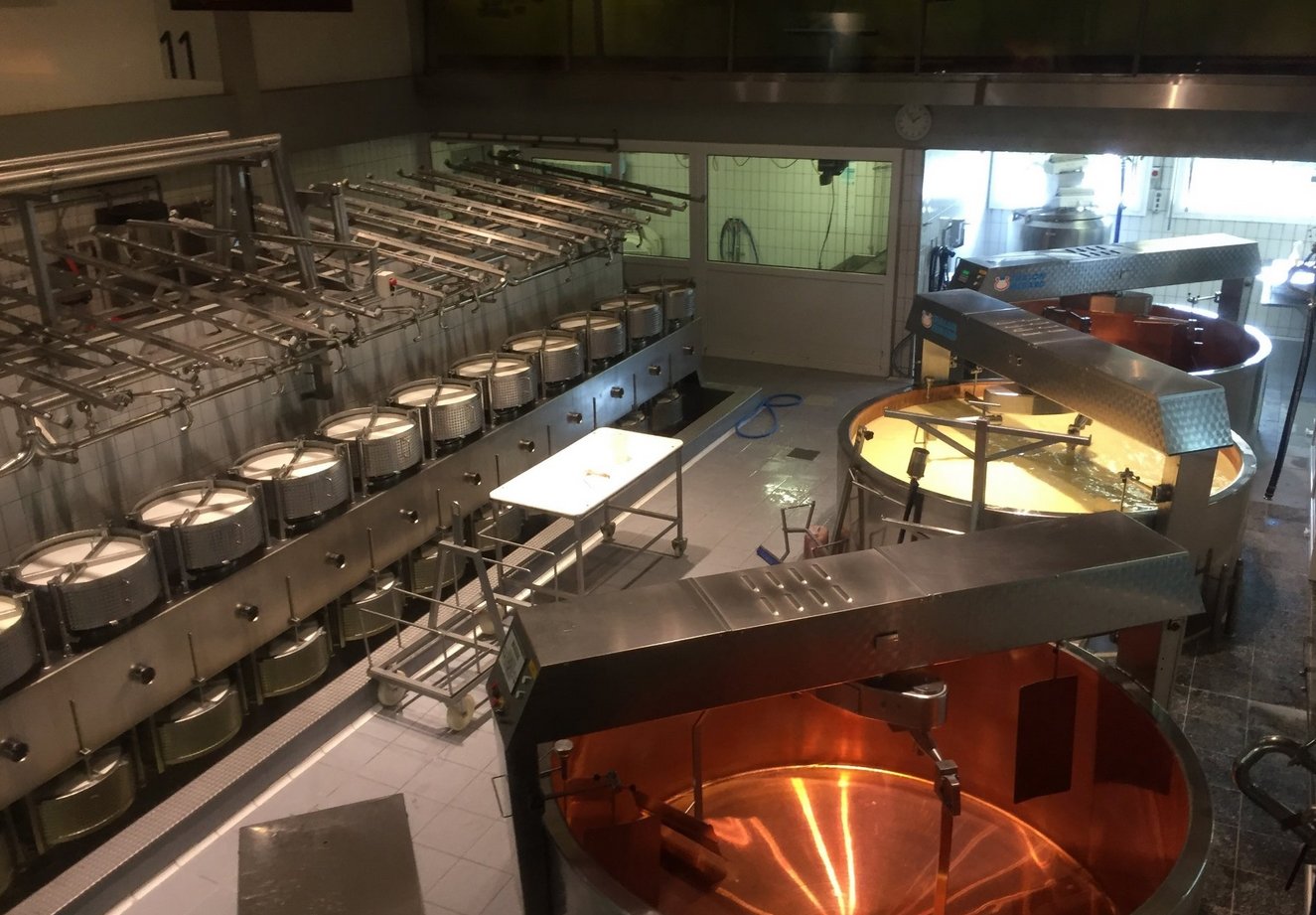Milk from the morning and evening milkings is mixed in vats, heated, yeast and a special enzyme are added to start the curdling process, which lasts about 50 minutes. The formed clot is cut with knives located in the vats and heated again at a temperature of 60 degrees for 45 minutes.