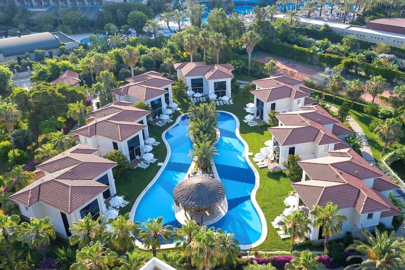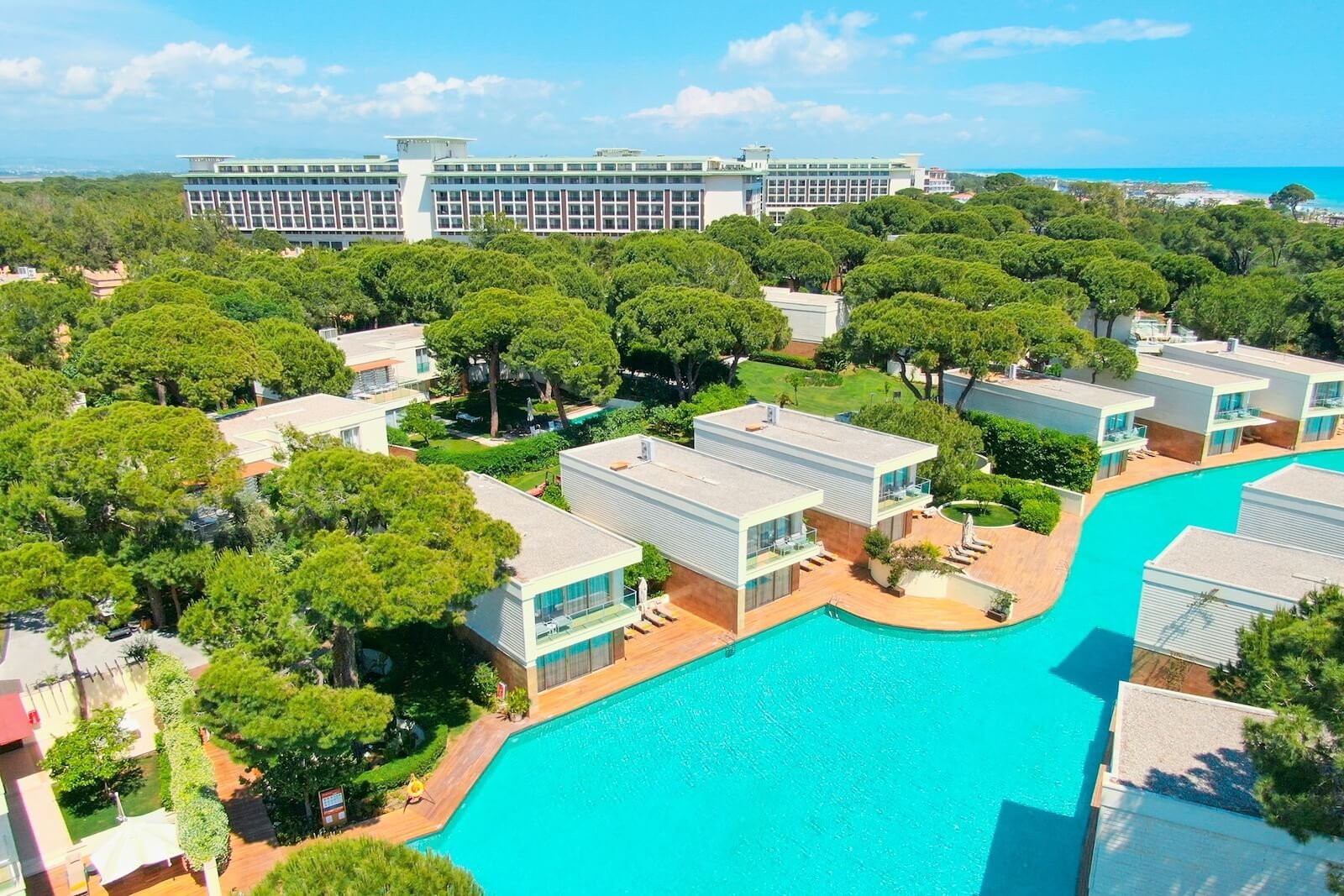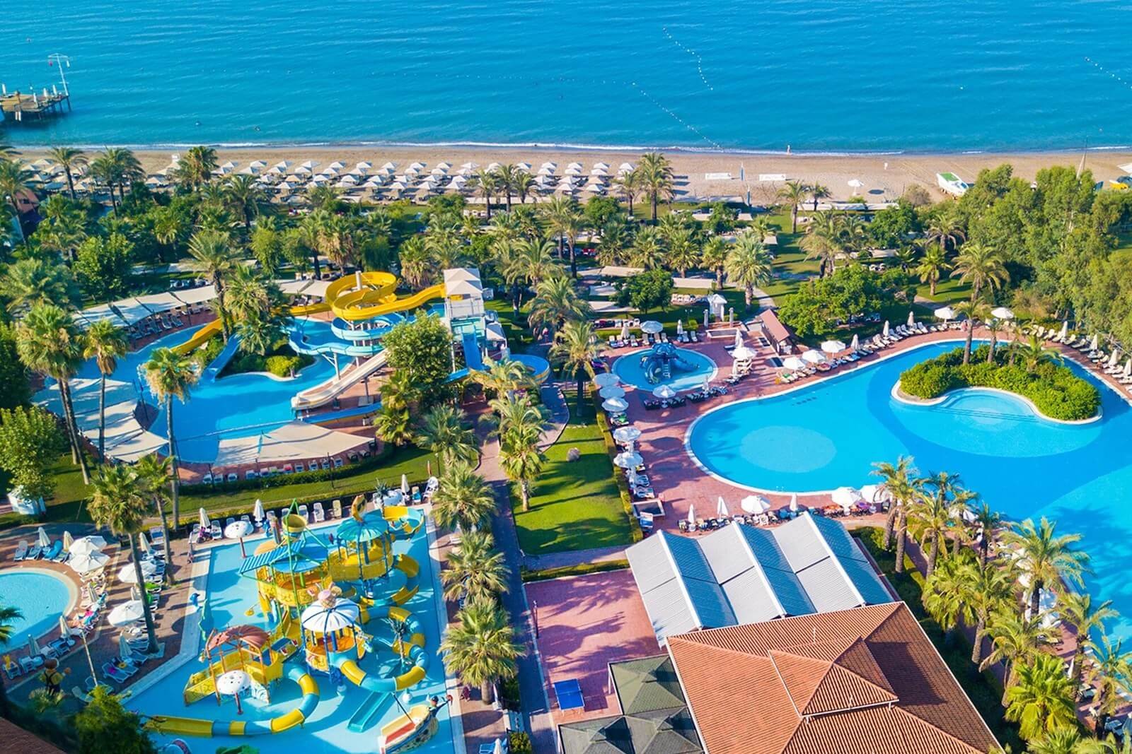 The territory resembles a European city (an open-air reception format and 2-3-story residential houses), where you can hide from the bright Turkish sun in the shade of tall, old pines, with many beautiful photo locations. The wide sandy beach is perfect for a family vacation with children. It’s ideal for those looking for a combination of service, excellent food, entertainment, sports activities, and more.