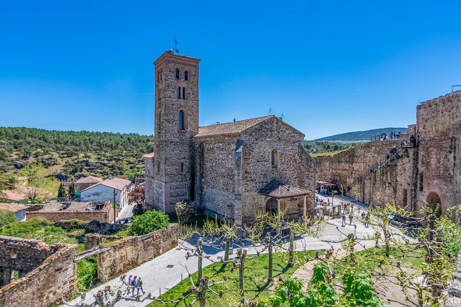 Passing through the tower arch, you will find yourself at Plaza de los Caídos near the castle church of Saint Mary, built 7 centuries ago, with a facade combining Gothic, Renaissance, and Mudejar architecture. The impressive Castillo de Buitrago del Lozoya castle, built in the 15th century in a square shape, is fortified with 7 towers. The main style of the castle masonry is Mudejar. The castle is surrounded by a two-level fortress wall 800 meters long with three entrances. You can walk along the lower part of the wall, parallel to the river, enjoying the stunning views from above. The upper – southwestern wall has limited access.