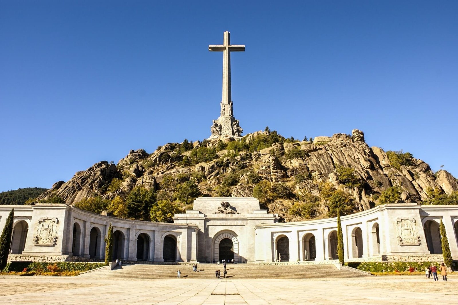 The Valle de los Caidos memorial group includes an esplanade, a basilica with a crypt, and a monument on a granite pedestal in the form of a cross, rising 150 meters. In the galleries carved into the rock, in wall niches, you will see several chapels where 33,700 Spaniards who died in the civil war are buried. Next to the complex is a monastery whose monks take care of the memorial.