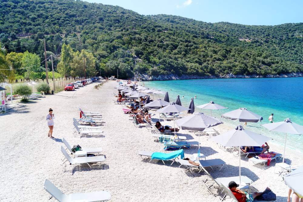 Located in a small village of the same name, 40 km from the island’s capital. The Ionian Sea here is very calm, the water is clear and clear, blue in color. The beach is pebbly and quite long. There are no sun loungers or umbrellas, but you can rent a boat and go on an exciting journey through the bays that are inaccessible by other means of transport. Restaurants and cafes are located in the immediate vicinity, and the village has an ancient castle with a panoramic view of the sea. Accessible by car, a great place for families with children. It is better to come to the beach in the morning to take a parking space, as it has a very modest size.