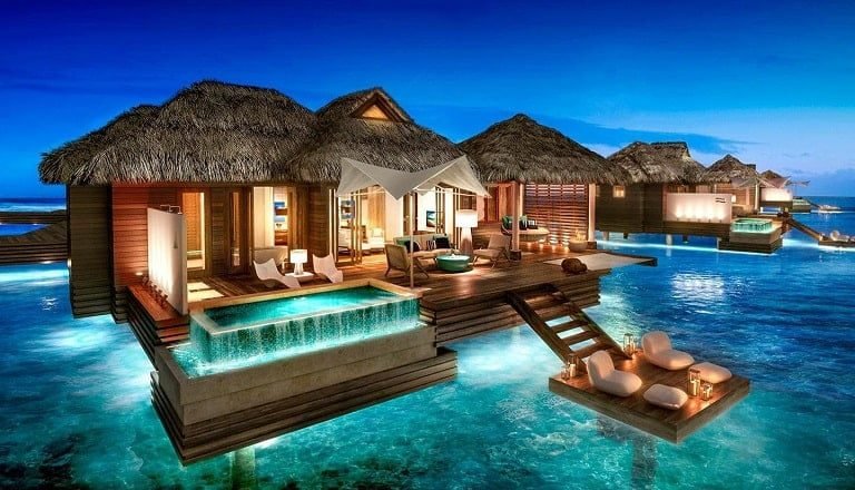 Windows offer views of a beautiful sandy beach. Almost every modern villa has a private pool and hot tub. The villas are set in a beautiful landscaped garden, with terraces offering sunset views. Guests enjoy walking barefoot on wooden floors, and the bathroom has a glass roof for stargazing at night.