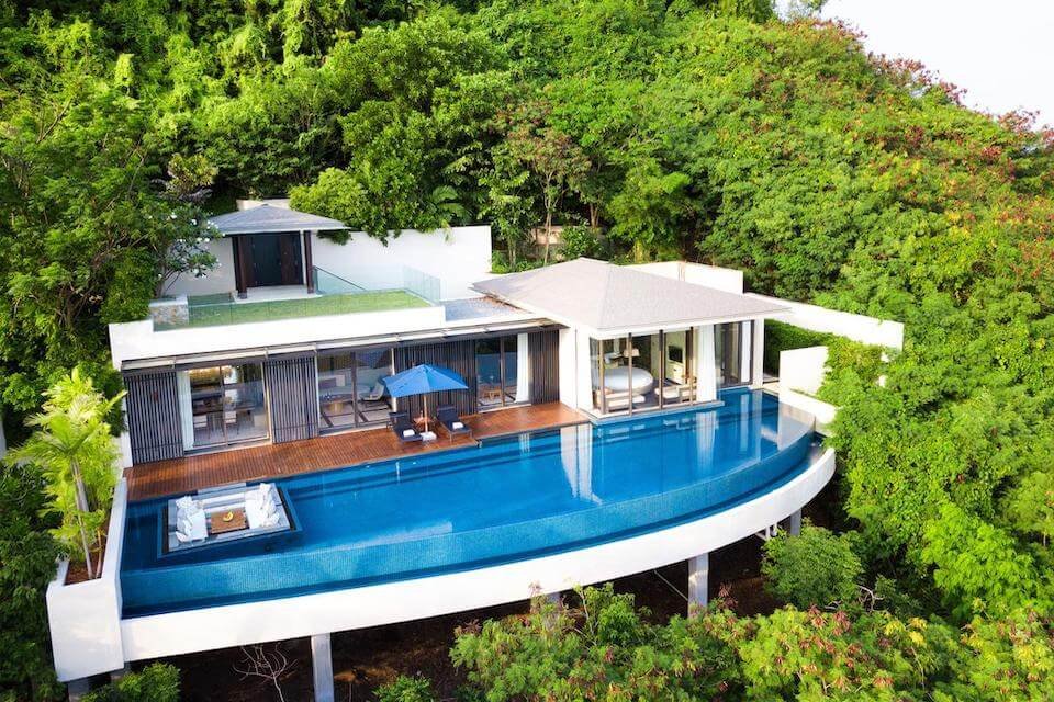 From the sea, it seems that this complex is simply immersed in greenery, with only the roofs visible. It offers guests truly luxurious accommodations. The secluded private beach allows for full enjoyment of the holiday, with views of the Gulf of Siam from the villa windows. The villas are situated on a hill where tropical trees and shrubs grow. The bathrooms are finished in marble.