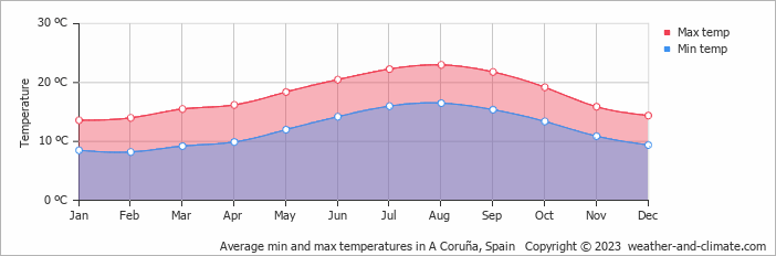 The climate in A Coruña is temperate warm. It is colder than most Spanish cities, however winter and summer temperatures are difficult to call extremely low for this area. The most precipitation falls in the winter months, and the strongest winds blow in early March.