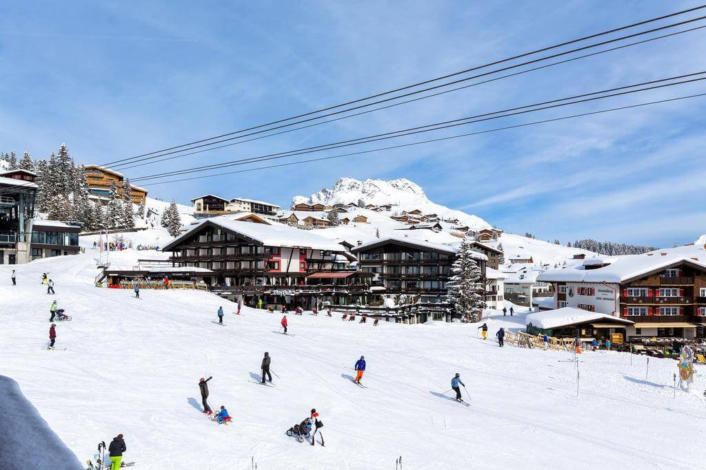 | – Large area for skiing- Large selection of premium hotels— Scenic views and a great atmosphere- Many tracks of different difficulty levels- Lots of restaurants | — High prices— Hotel rooms and some instructors need to be booked in advance, sometimes a year in advance.— Young tourists will find the resort boring.— If you want to ride the slopes of St. Anton, you’ll have to take the bus. |
