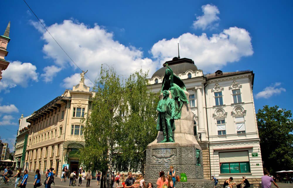 The square was named Preseren Square in 1905 in honor of the prominent Slovenian poet Franze Prešeren, who wrote the lyrics for the Slovenian national anthem. Around the same time, a monument to Prešeren was erected in the square, facing the window of the house where the poet’s muse once lived.