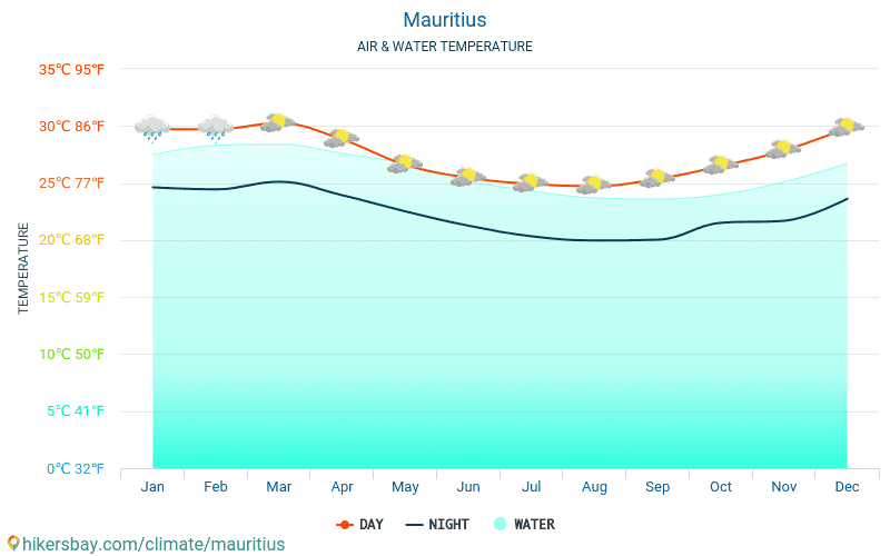 The most rainfall falls in the central part of Mauritius, the least in the north and west. Usually, a tropical downpour begins after 2 p.m., so active recreation, walks and swimming should be planned for the morning and the first part of the day.