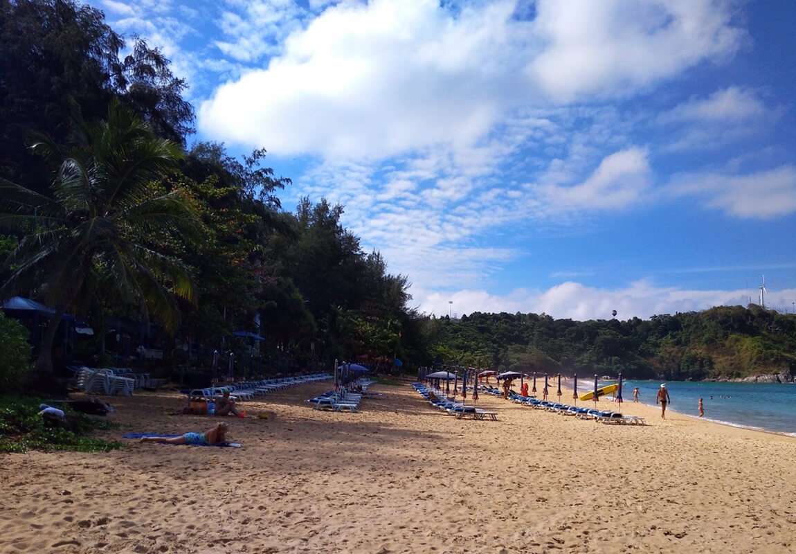 If you look at the photo of Nai Harn beach, you can see a smooth and fairly long coastline, surrounded by hills (capes Kata and Promtep) and crystal clear sea. Nearby is a large cassowary park with unique Aeolian trees, and a small salt lake that children love. To the left of it is a sports field and a cozy children’s playground.