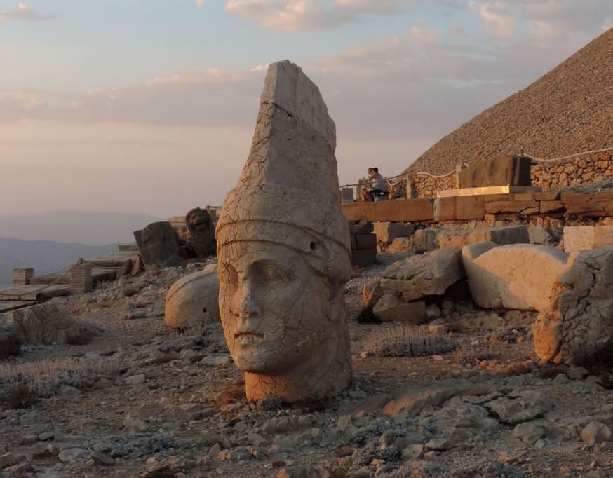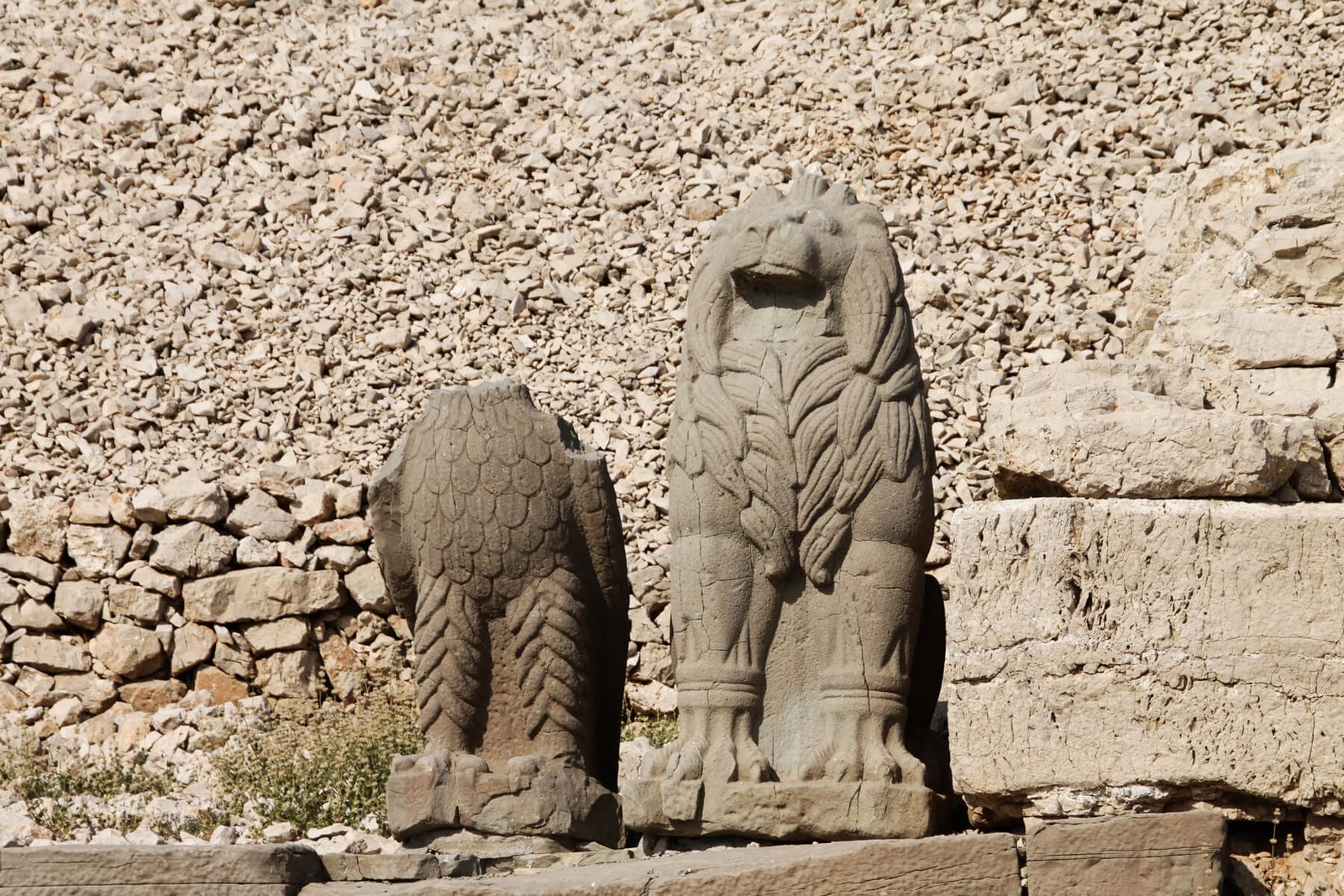 Currently, on Mount Nemrut-Dag in Turkey, the ruins of a once majestic tomb are preserved, the analogues of which are still not found in the whole world. Scientists have not been able to name the exact cause of the destruction of this monument. Some of them believe that it was damaged by numerous earthquakes characteristic of the region. Others suggest that damage to the object could have been caused by one of the foreign invaders. Nevertheless, some fragments of the tomb managed to reach our days in good condition. What can you see on the mountain?