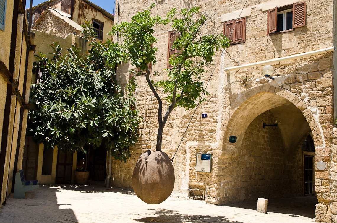 The floating orange tree was designed and created by sculptor Ran Morin in 1993. The tree grows in a large oval pot, and it looks as if it is hatching from an egg. The pot hangs on strong ropes attached to the walls of nearby buildings.