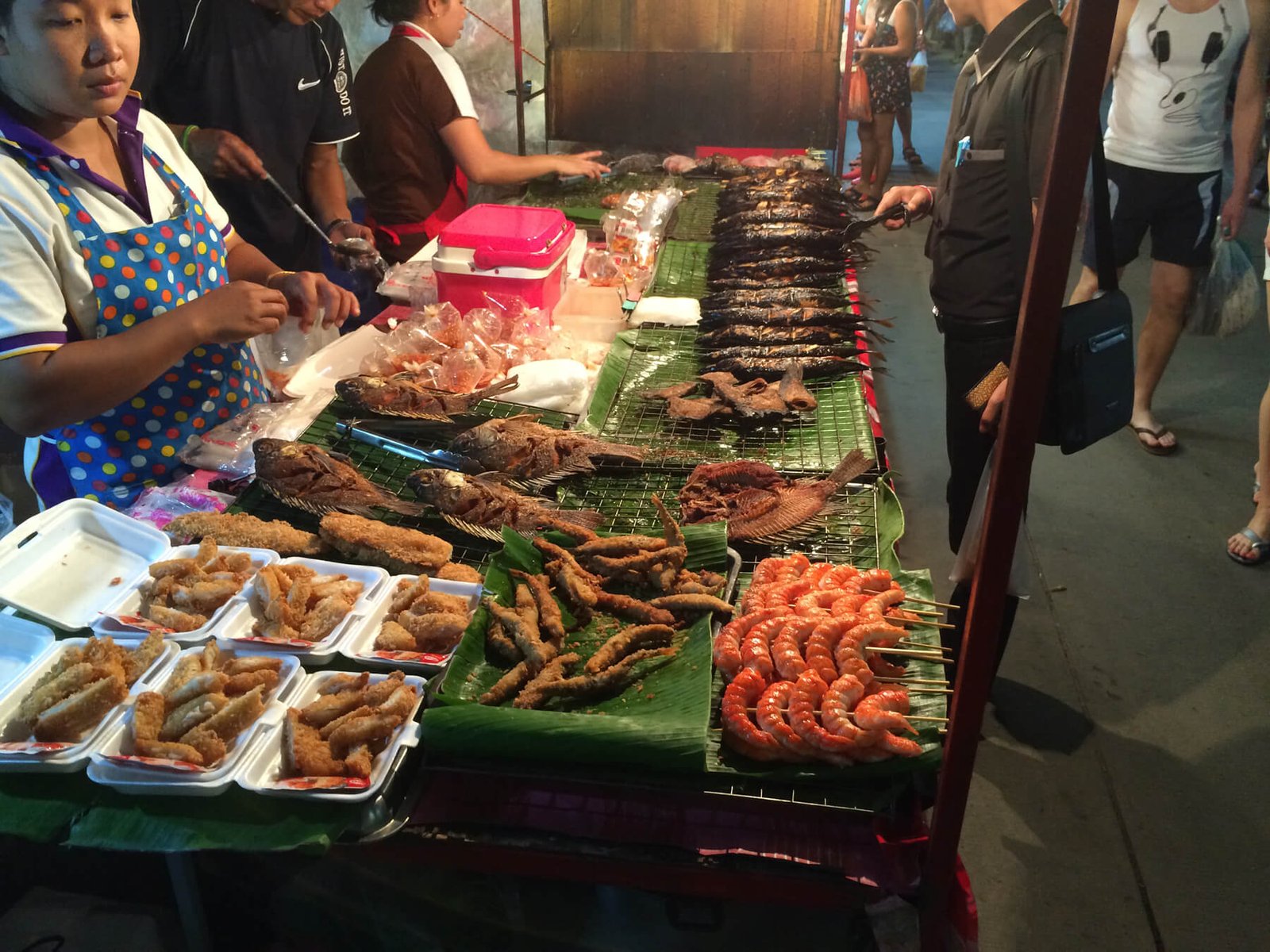 There are clothes, bags, souvenirs, cosmetics – the range is huge, so there are a lot of buyers. Food stalls are also available. A very large selection of seafood that can be immediately prepared. All the food is very tasty, everything is always fresh.