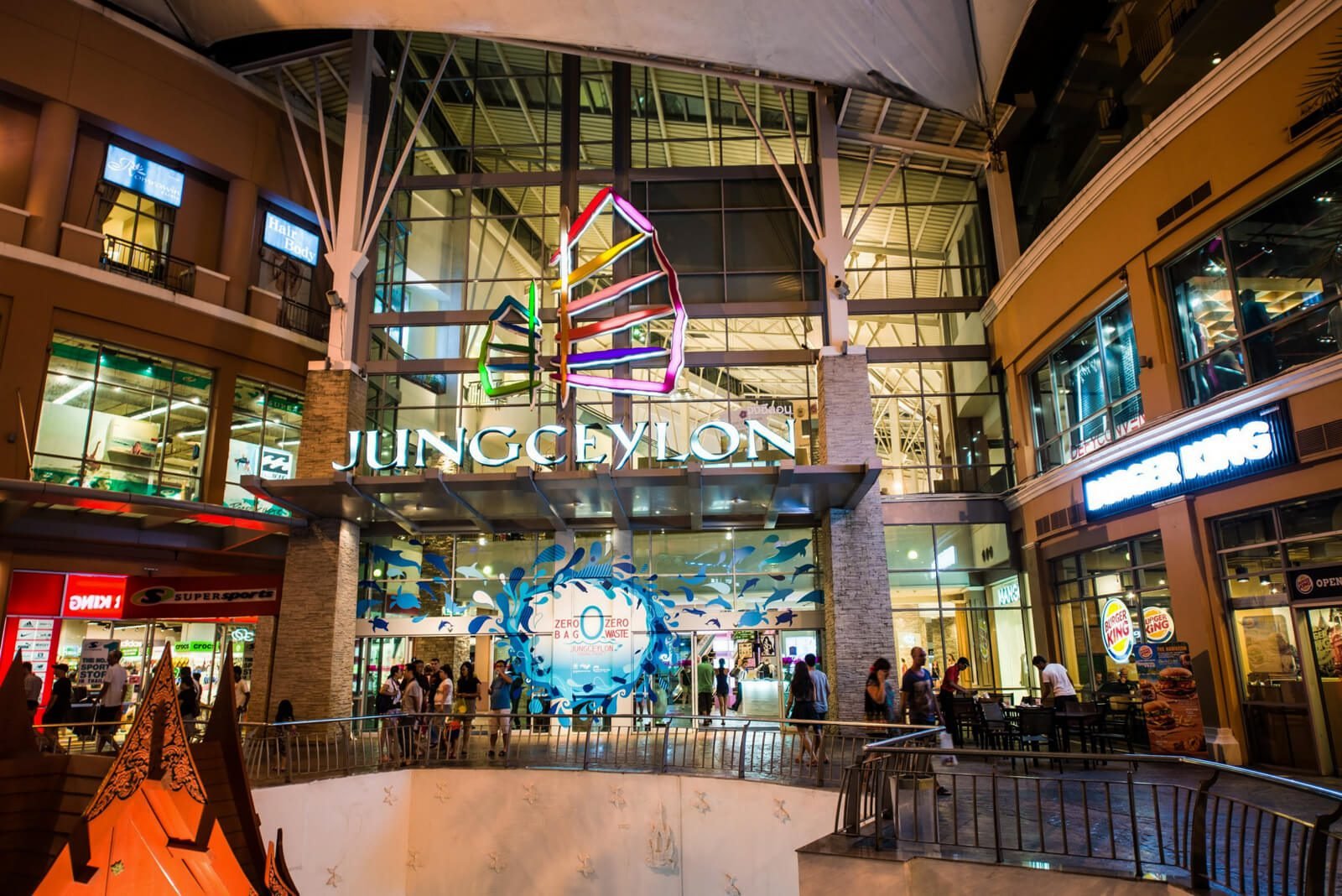 The main and largest shopping center in Patong is Jung Ceylon, located at the intersection of Soi Sansabai and Thanon Ratuthit Songroipi Road. In Jang Ceylon, you can buy branded clothing, sports goods, and children’s goods. The shopping center has a movie theater, Strike Bowl bowling club, cheap cafes and expensive restaurants. A light and music show is held in the evening on the central Jung Ceylon Square, where a junk is installed and numerous fountains are working.